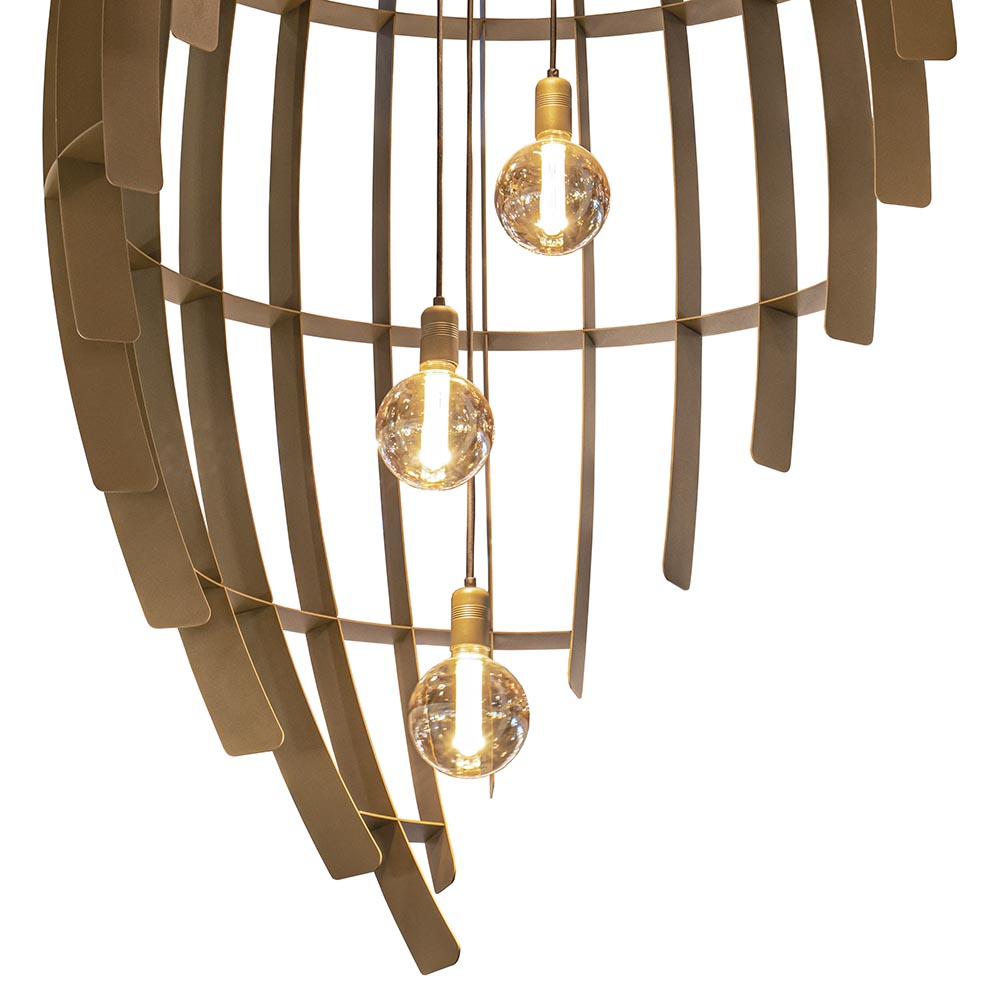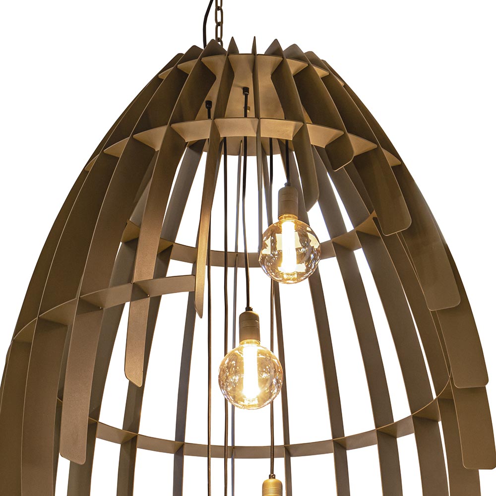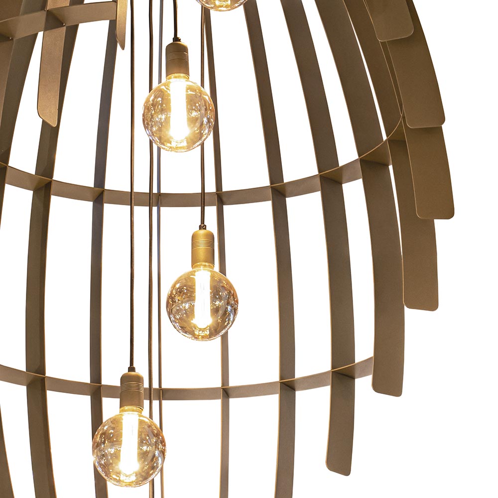 Met deze prachtige hanglamp weet u zeker dat u een statement maakt in uw woning. De grote hanglamp heeft een doorsnede van 98 cm en een hoogte van 180 cm. Dit maakt de lamp perfect voor in een vide of ruimte met een hoog plafond. De grote kap is volledig vervaardigd van metaal en uitgevoerd in het platinum. Dit geeft de videlamp een chique uitstraling die mooi is toe te passen in diverse woonstijlen, van chic tot industrieel. De metalen kap heeft een open structuur die ook verspringt. Hierdoor krijgt de lamp vanuit iedere hoek een andere look. Binnenin de kap is de lamp voorzien van 5 lichtpunten met een E27 fitting. De grote metalen kap wordt opgehangen aan een stevige ketting die op lengte is te maken. Deze prachtige videlamp maakt het interieur helemaal af.