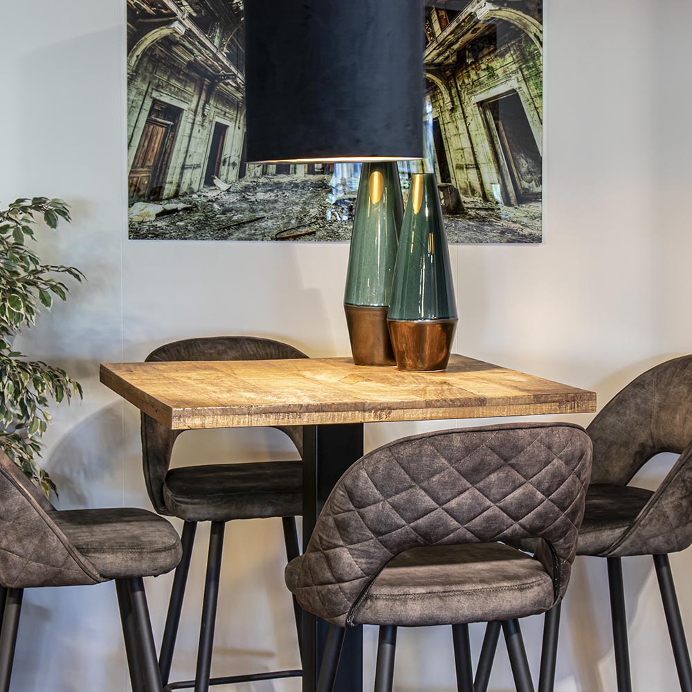 Een leuke bartafel om heerlijk aan te borrelen. De tafel heeft een afmeting van 80×80 cm en het blad is 5 cm dik. Het vierkante mango houten blad wordt ondersteund door een stevige metalen poot die is voorzien van een mat zwarte finish. De combinatie van het zwart en het hout geeft de bartafel een stoere look die mooi matcht in een landelijk of industrieel interieur. De bartafel heeft een hoogte van 106 cm.