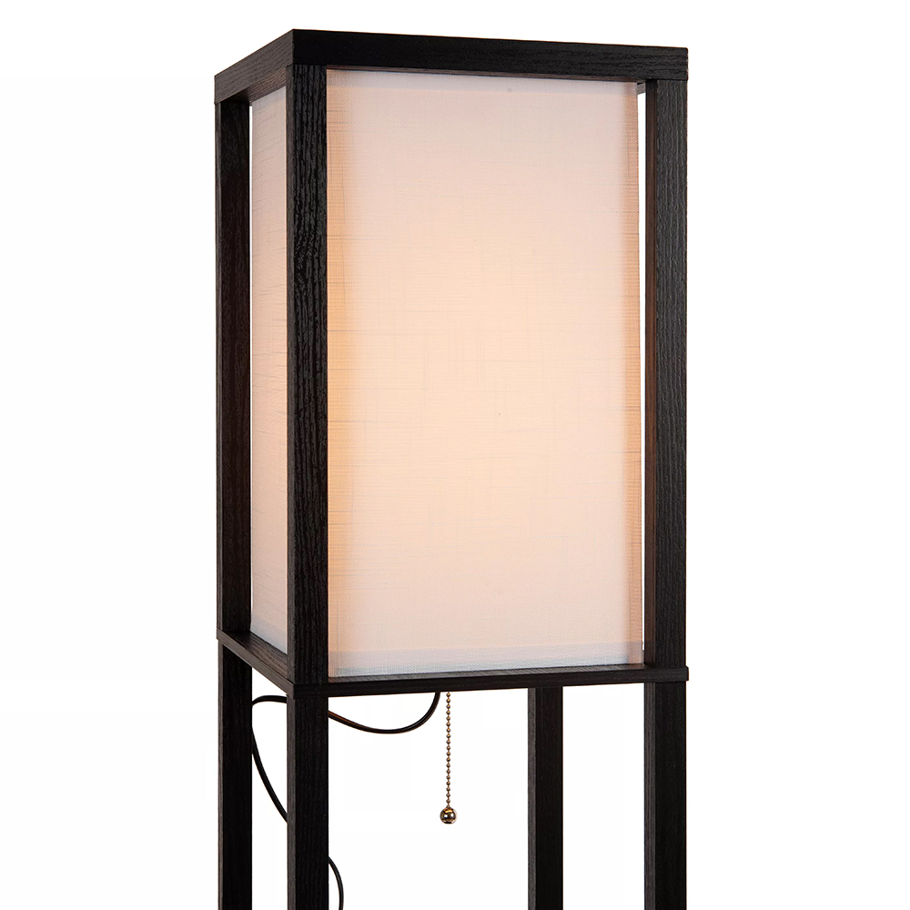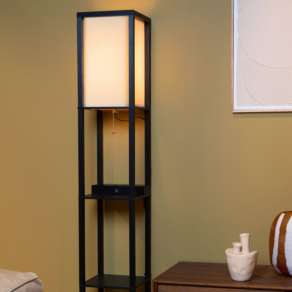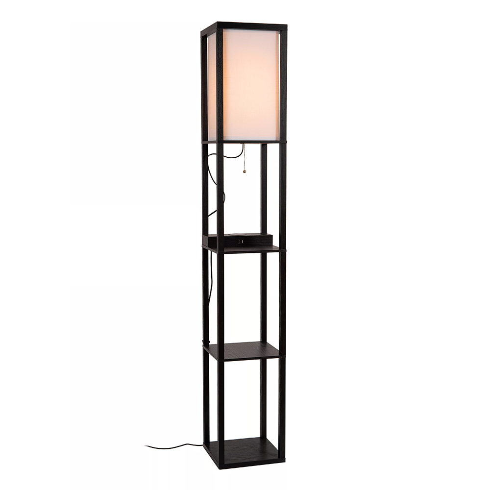 Deze sfeervolle vloerlamp is gemaakt van hoogwaardig mdf en uitgevoerd in het mat zwart. Dit is mooi gecombineerd met een beige kantoenen kap die zorgt voor diffuus licht in de ruimte. Leuke eigenschap van deze vloerlamp is het oplaadplatform op het bovenste plankje. Deze is voorzien van USB aansluitingen en een draadloze oplader. Ideaal voor in de woonkamer of slaapkamer. De overige plankjes zijn prima geschikt om wat leuke accessoires, plantjes of boeken op neer te zetten. De zwarte vloerlamp met kap is voorzien van een snoer met een lengte van 180 cm en wordt gemakkelijk aan en uit geschakeld dmv de nostalgische trekschakelaar onder de kap.