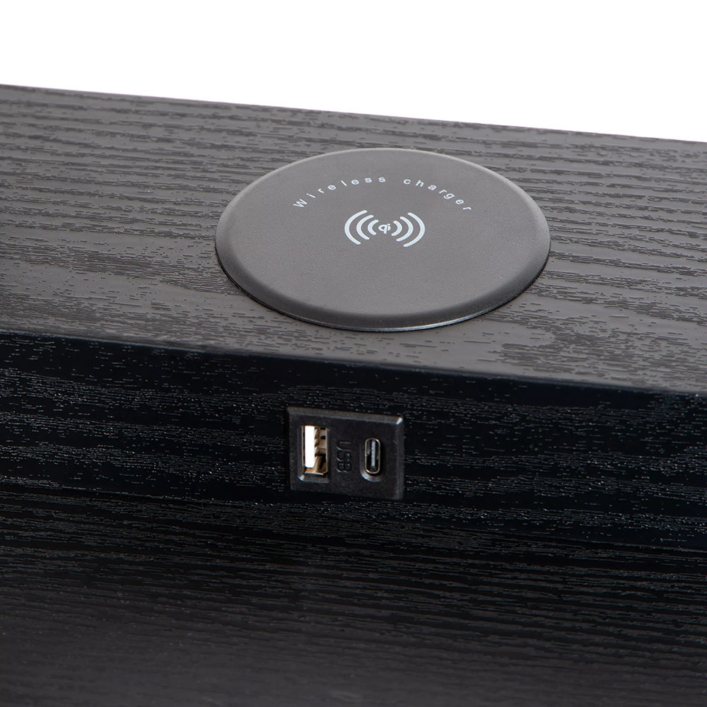 – afm: 26x26x162 cm – kap: 22x22x38 cm – mdf hout, zwart – katoenen kap, beige – zwart snoer: 180 cm – inclusief oplaadplatform – exclusief lichtbron (E27)