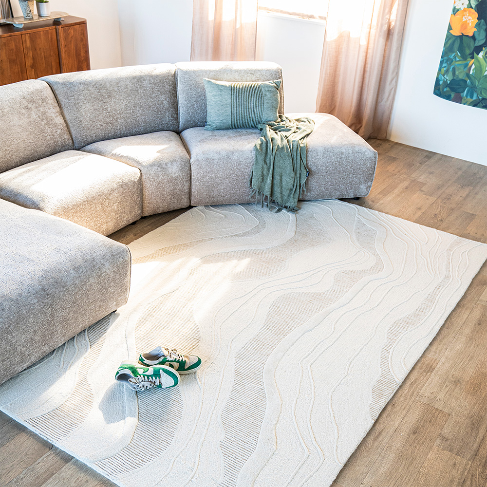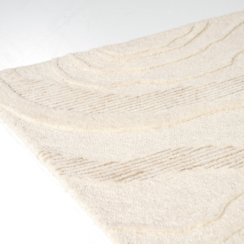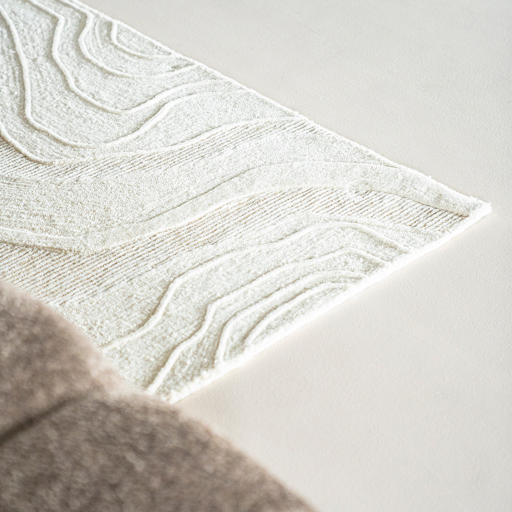Het “Soil” vloerkleed in off-white combineert een gladde pool met organische reliëflijnen, voor een rustige, natuurlijke look in je interieur.