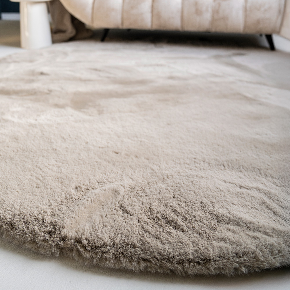 Korte omschrijving Zacht rond vloerkleed met luxe glans en gemêleerd oppervlak. Perfect voor een elegante, rustige sfeer in je interieur.
