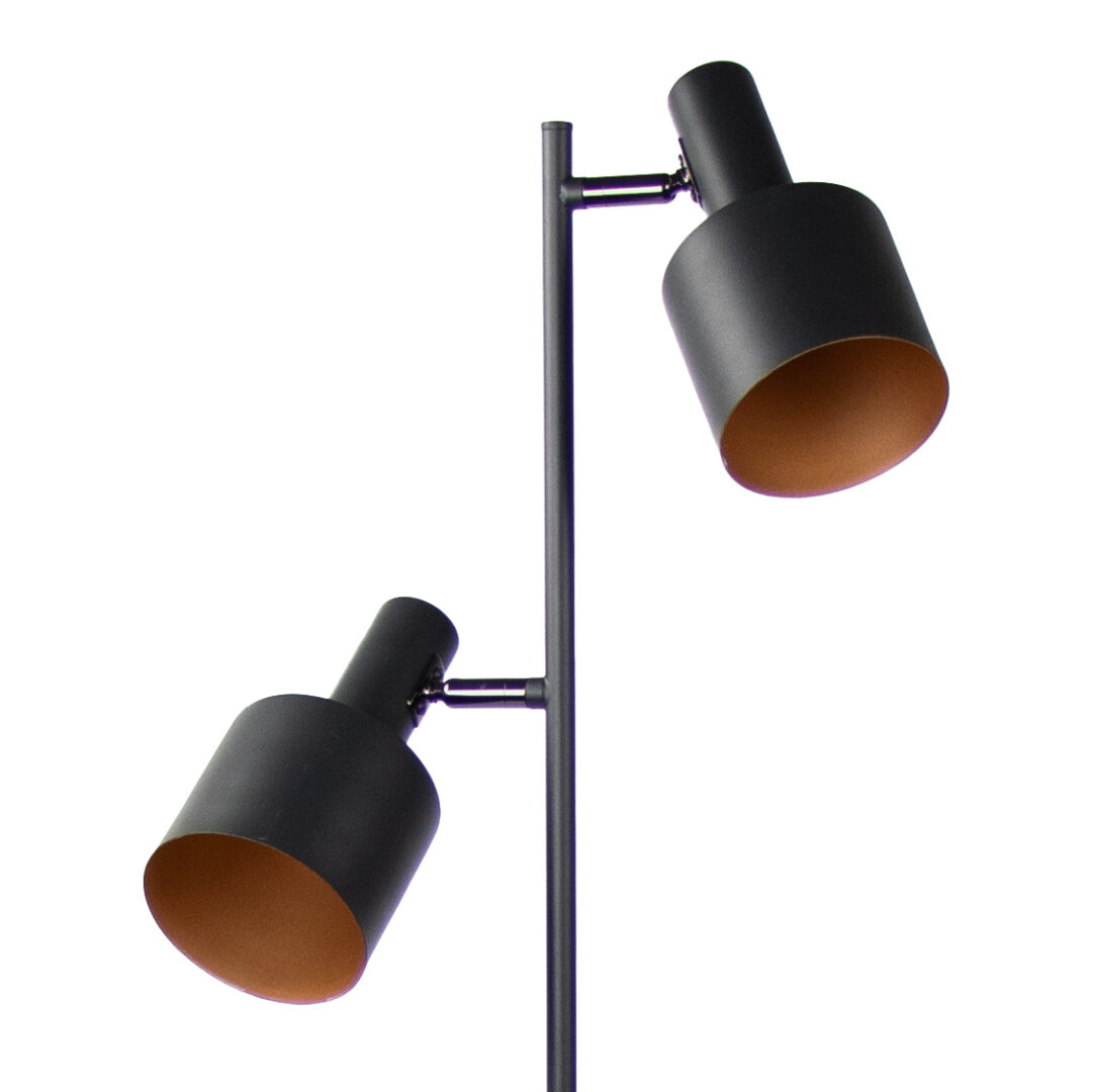 Deze moderne vloerlamp heeft een strakke uitstraling die mooi past binnen de huidige woontrends. Het zwarte armatuur wordt ondersteund door een goudkleurige coating aan de binnenkant van de kapjes. Deze zijn helemaal naar wens te verstellen door de kapjes te draaien ot te kantelen. Ook zijn de lampjes afzonderlijk van elkaar aan/uit te doen door middel van de schakelknop op de achterkant van de kap. Ideaal voor in de woonkamer in een donkere hoek of naast de bank. De stijlvolle vloerlamp heeft een zwarte snoer dat is voorzien van een schakelaar.