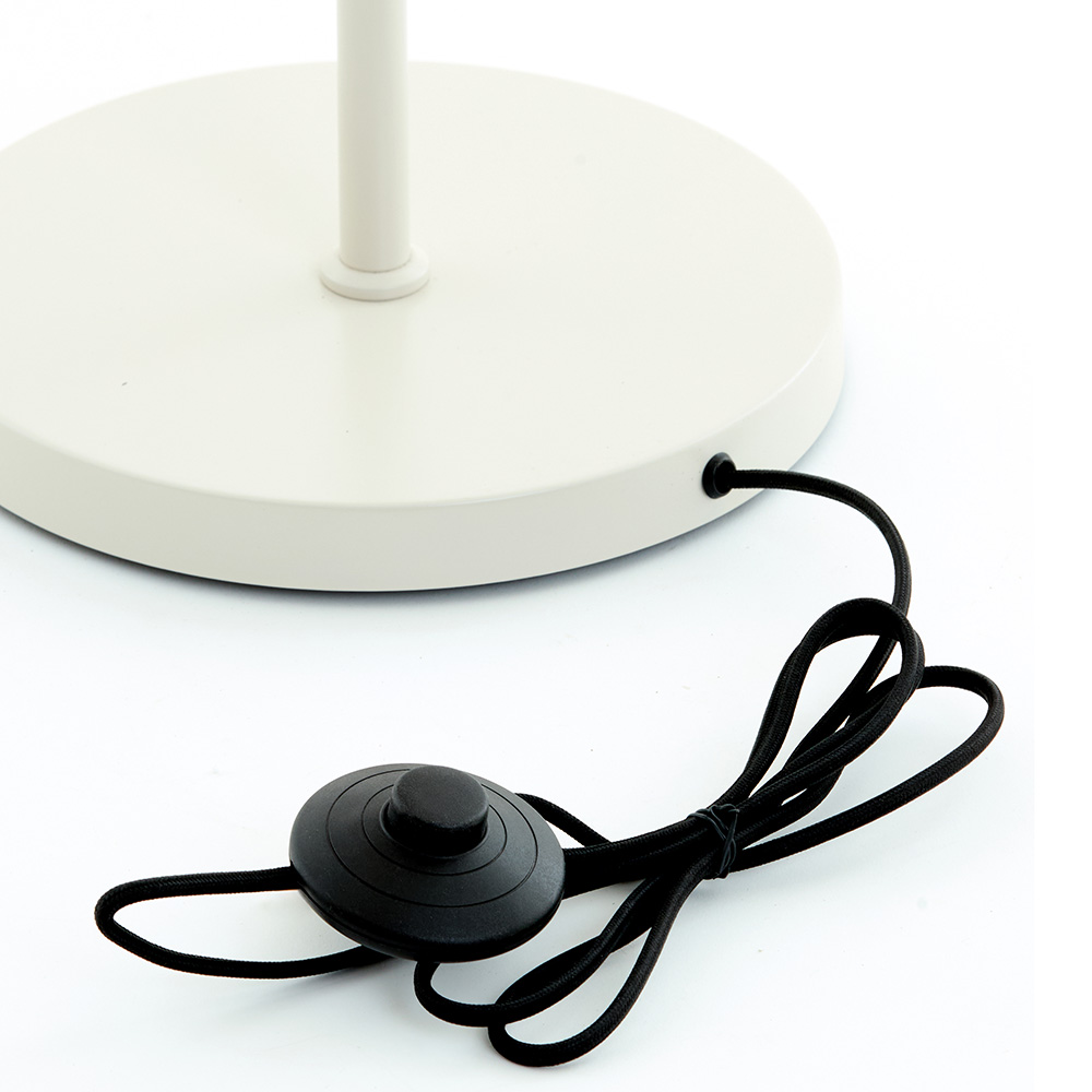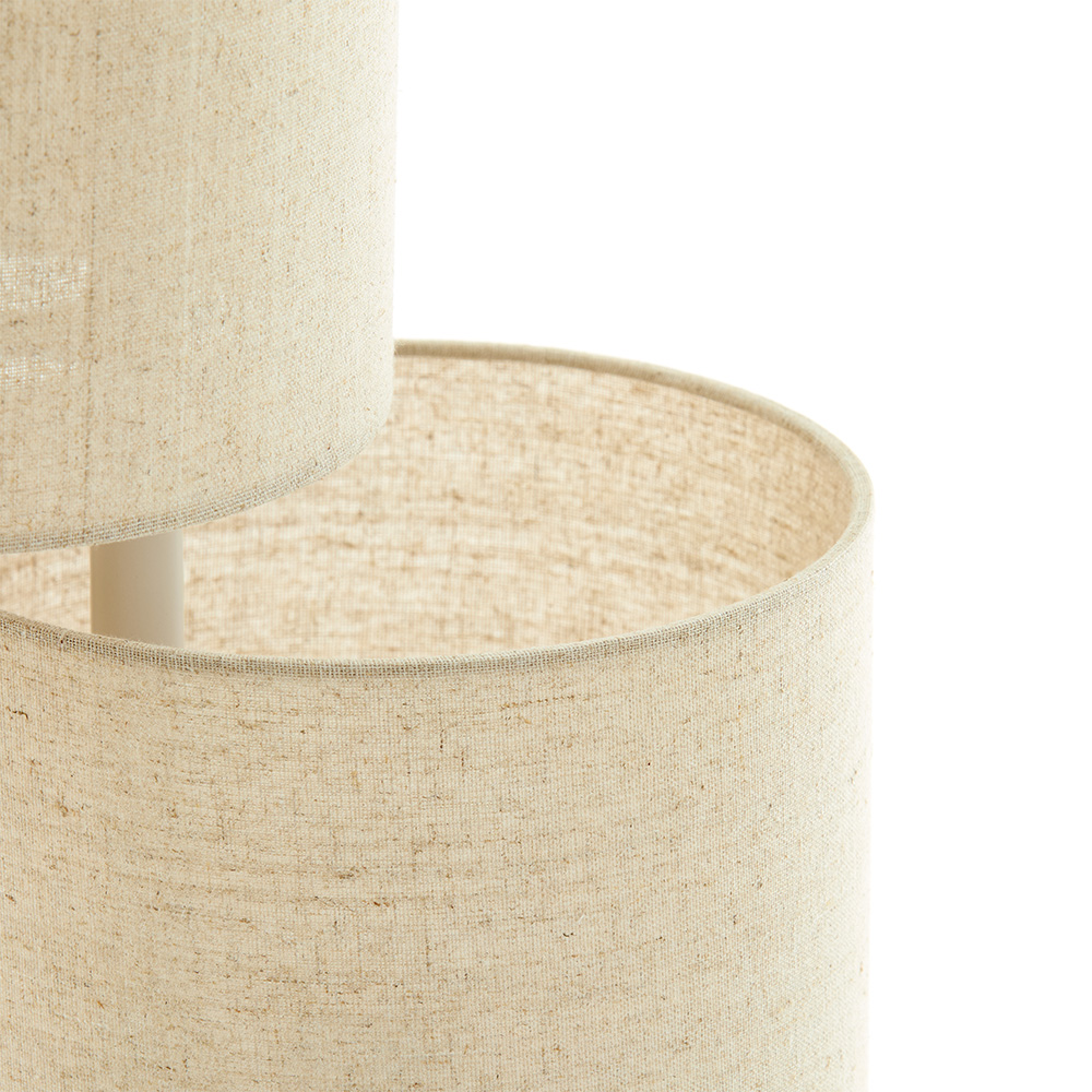 Details: – Afmetingen: 21x33x155 cm – Voet: Ø25×3 cm – Kappen: Ø21×22 cm – Materiaal: metaal & stof – Kleur: zand & wit – Snoer: 175 cm – Schakelaar op 56 cm