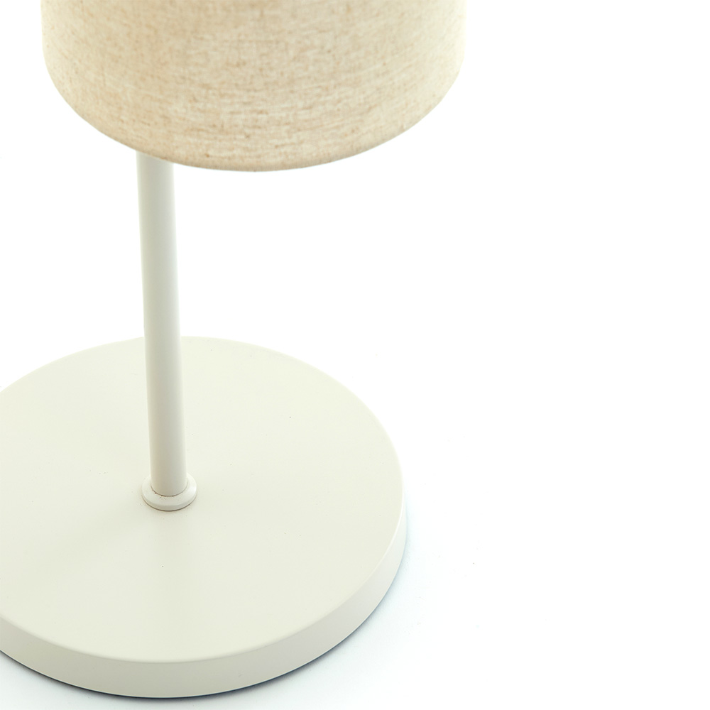 Deze moderne en elegante lamp heeft een minimalistisch ontwerp dat een verfijnde sfeer toevoegt aan elke ruimte. De lamp is opgebouwd uit vijf cilindrische lampenkappen, die gemaakt zijn van een natuurlijke stof in lichte tinten. Dit zorgt voor een zachte, warme verlichting die de ruimte gezellig maakt. Het slanke metalen frame in een neutrale witte kleur is zowel stevig als stijlvol, met een stevige ronde basis die stabiliteit biedt. De lamp heeft een praktisch, gemakkelijk bedienbare schakelaar aan de kabel, waardoor hij eenvoudig aan en uit te zetten is. Perfect voor het verlichten van een leeshoek of als statementstuk in je woonkamer of slaapkamer.