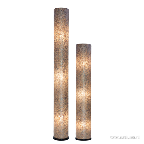 Gemaakt met een fiberglas mal en ingelegd met stukjes gebroken capiz schelpen. Deze schelpen vloerlamp brengt een hoop sfeer en warmte in huis. De schelpen brengen een beetje strand en zomer naar binnen en zorgen voor een sfeervol effect wanneer de lamp staat ingeschakeld. De cilinder vormige lamp staat op een ronde zwart voet en heeft een zwart snoer met schakelaar. De kap is van binnen voorzien van drie lichtbronnen (E14, exclusief) die het licht mooi verdelen over de lengte van de vloerlamp.