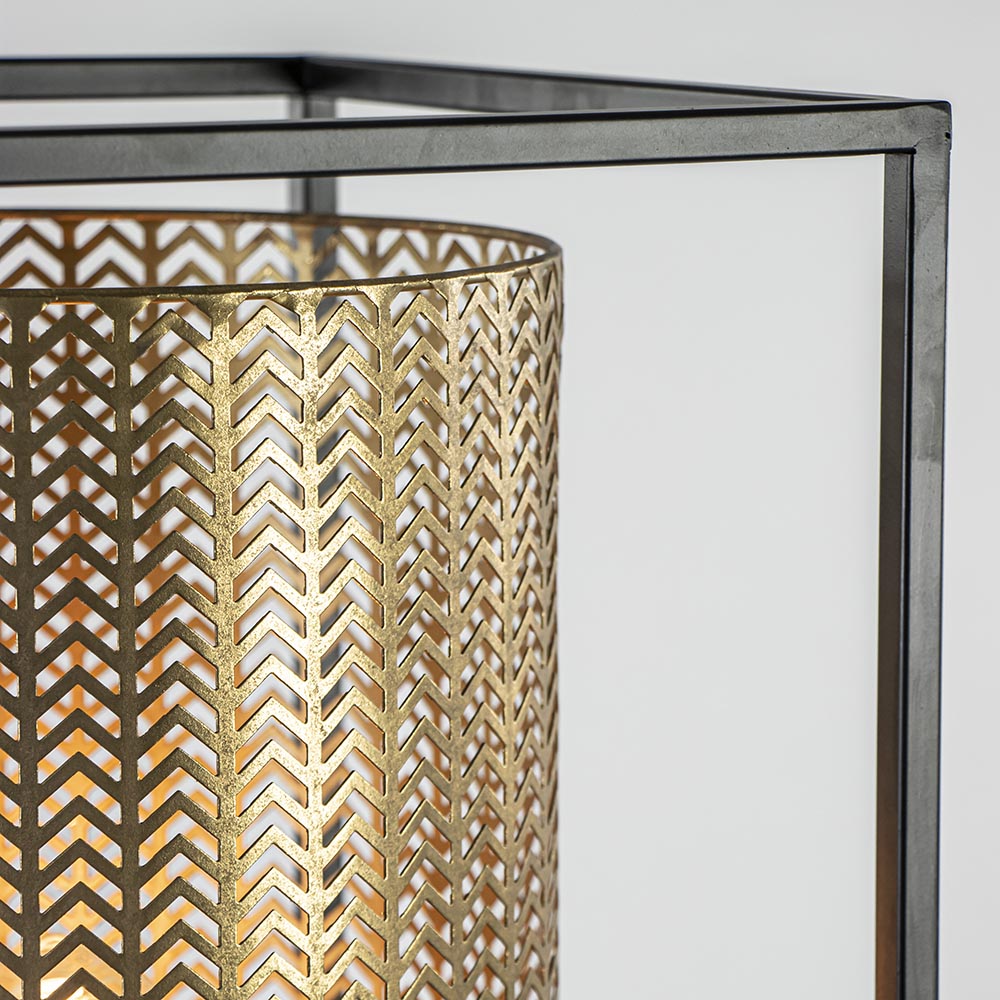 Strak en sfeervol in één. De vierkante vloerlamp is volledig van metaal en bestaat uit een zwart frame die een gouden cilinder-vormige kap ondersteund. Het mat zwarte frame heeft een dikte van 1,5 cm en is voorzien van ronde pootjes. De gouden kap heeft een dessin waar het licht mooi doorheen kan schijnen, maar zorgt ook dat er niet direct in de lichtbron kan worden gekeken. Aan de onderzijde van de gouden kap begint het snoer met een lengte van 290 cm, welke is voorzien van een voetschakelaar. Deze sfeervolle vloerlamp is gemakkelijk toe te passen in diverse woonstijlen als landelijk, romantisch of Oosters. De rechthoekige vloerlamp frame wordt geleverd zonder lichtbron (E27).