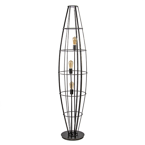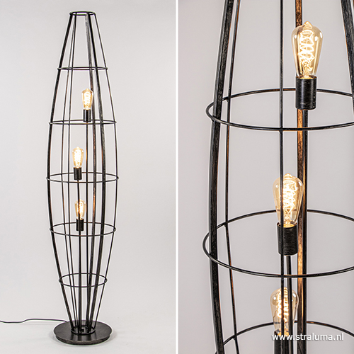 – lamp heeft een hoogte van 174 cm en een Ø van 39 cm – voet heeft een Ø van 32 cm en een hoogte van 3 cm – metalen frame in zwarte antiek finish – zwart snoer van 335 cm, schakelaar op 200 cm – exclusief lichtbronnen (3x E27)