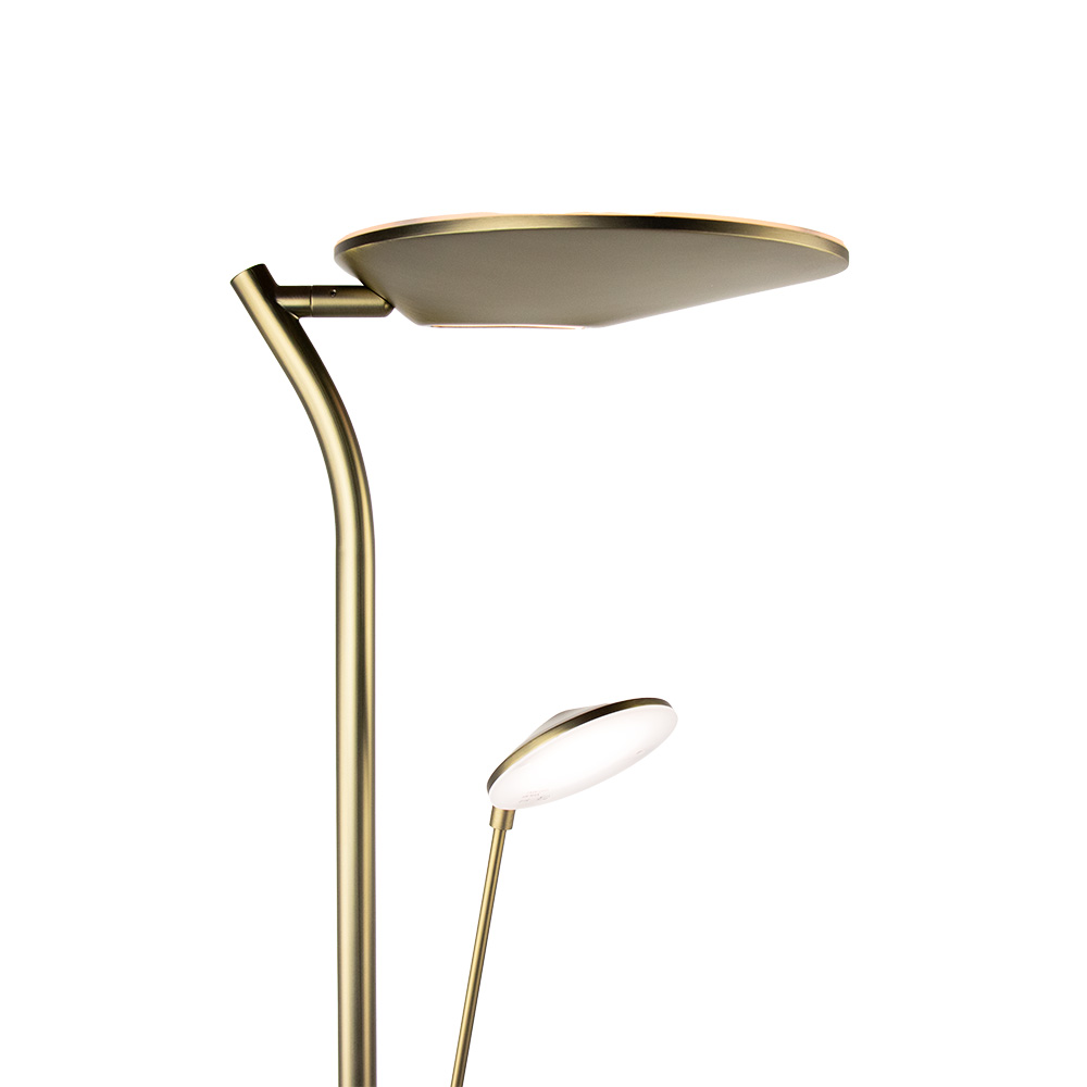 Details: -Afmeting: 38×180 cm – Kap: Ø28×1 cm – Voet: Ø30×2 cm – Kleur: Brons – Materiaal: Metaal – Geintergreerd LED – Uplighter: 2700 lumen – Leeslamp: 540 lumen – Draai- & kantelbaar