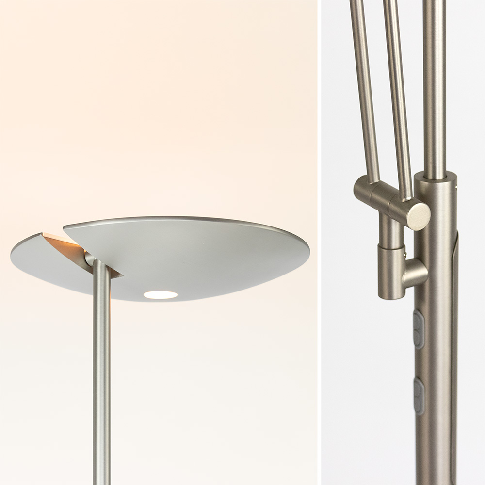 Details: -Afmeting: 23x44x182 cm – Kap: Ø23×1 cm – Voet: Ø23×4 cm – Kleur: Nikkel – Materiaal: Metaal – Geintergreerd LED – Uplighter: 2700 lumen – Leeslamp: 540 lumen – Draai- & kantelbaar