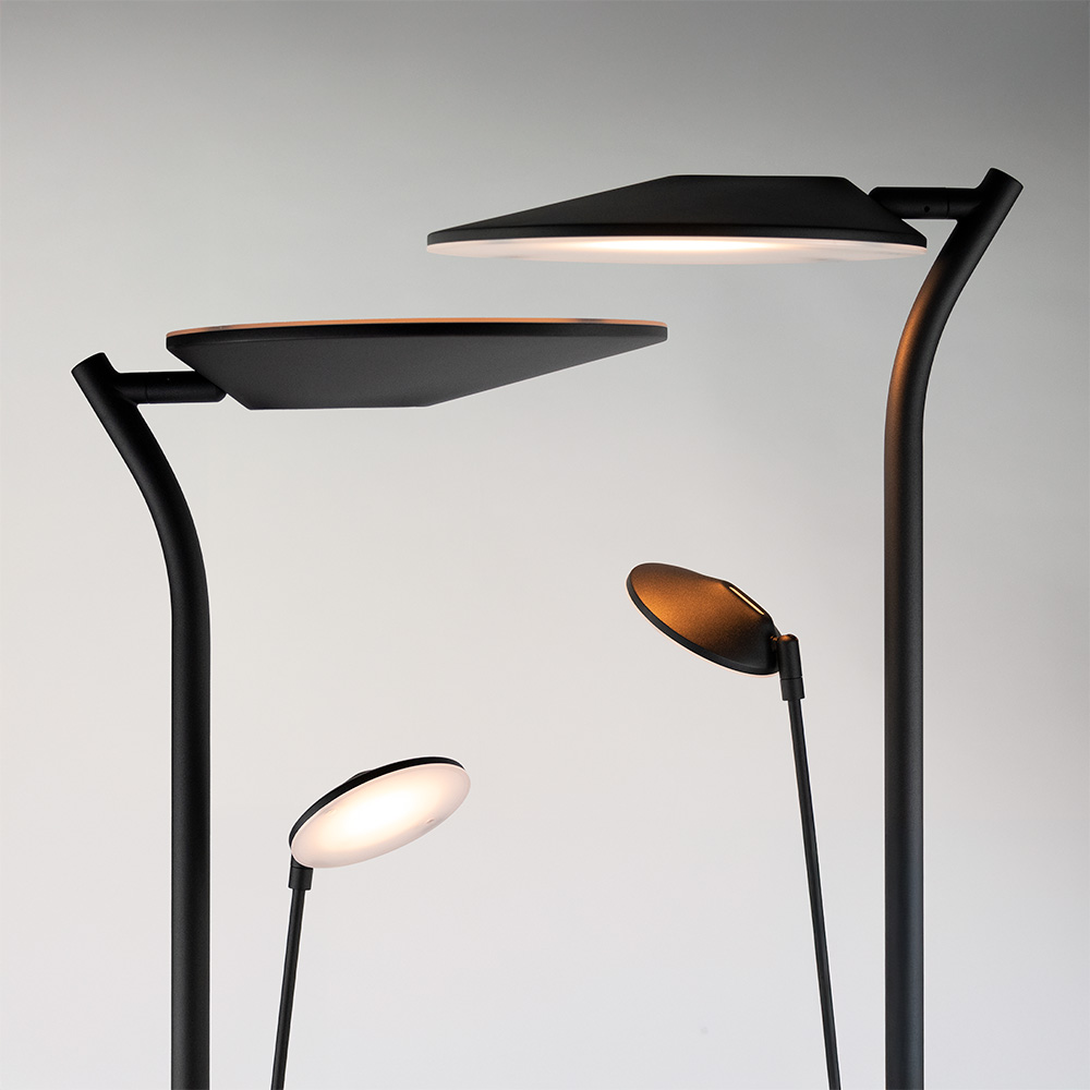 Details: – Afmeting: 39x30x180 cm – Kap: Ø28×4,5 cm & 10,5x3cm – Voet: Ø30×2 cm – Kleur: Zwart – Materiaal: Metaal – Geintergreerd LED – Uplighter: 2700 lumen – Leeslamp: 540 lumen – Draai- & kantelbaar