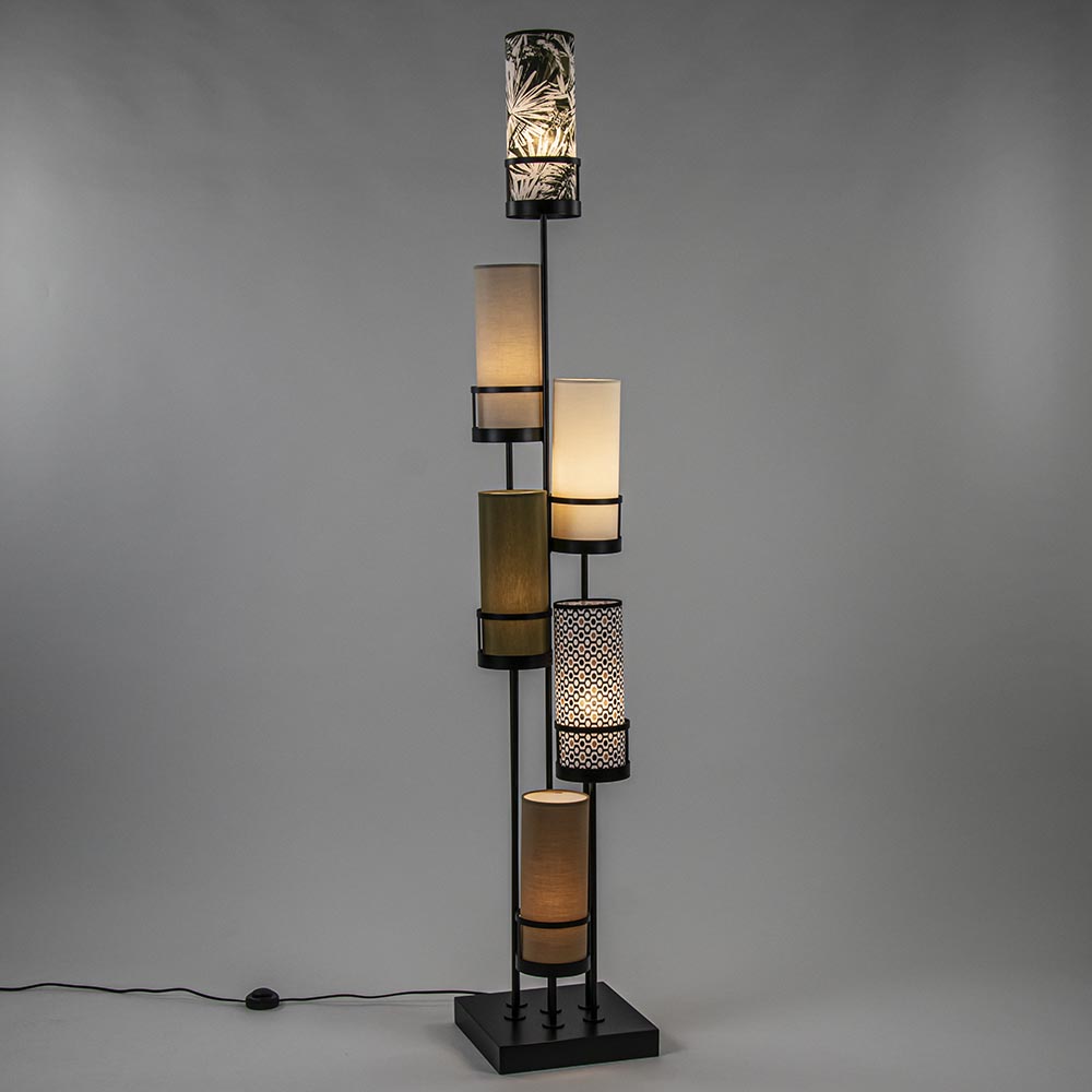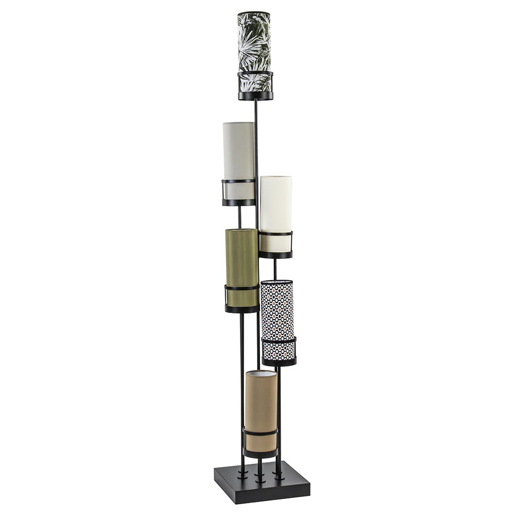 Breng een beetje kleur in uw woning met deze moderne vloerlamp. De lamp is voorzien van diverse kleuren en dessins en heeft een speelse en toch strakke vorm, het doet bijna denken aan een kunstobject. Het leuke aan de staande lamp, is dat de kappen los zitten en u zelf kan bepalen welke kleur u waar wilt plaatsen. Zo kan u de kappen veranderen van plaats en zo de lamp weer een beetje een andere look geven. De kappen worden ondersteund door een metalen frame die zijn bevestigd op de mat zwarte vierkante voet. Deze vrolijke vloerlamp wordt geleverd inclusief zwart snoer met schakelaar en exclusief lichtbronnen (6x E14).