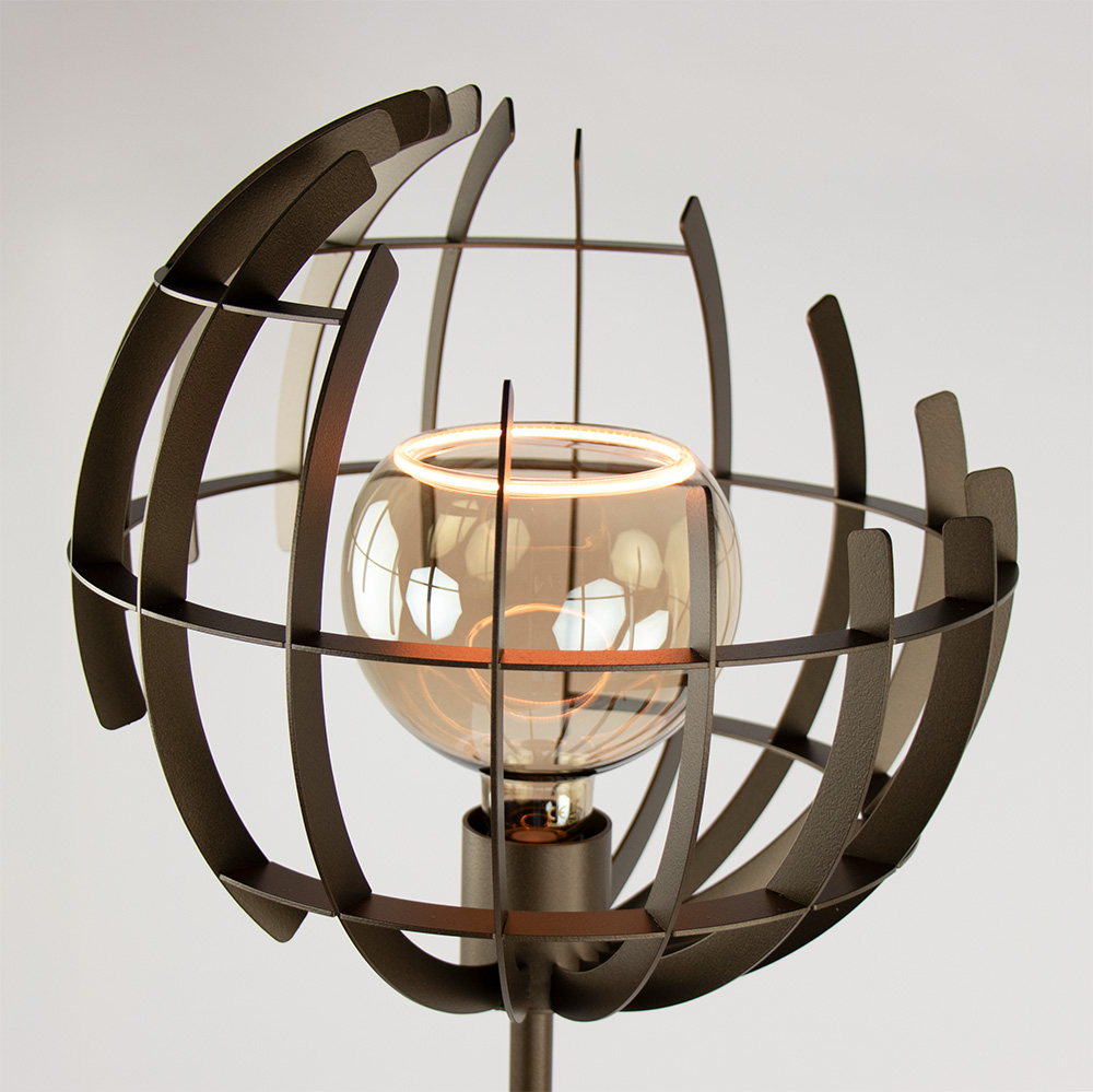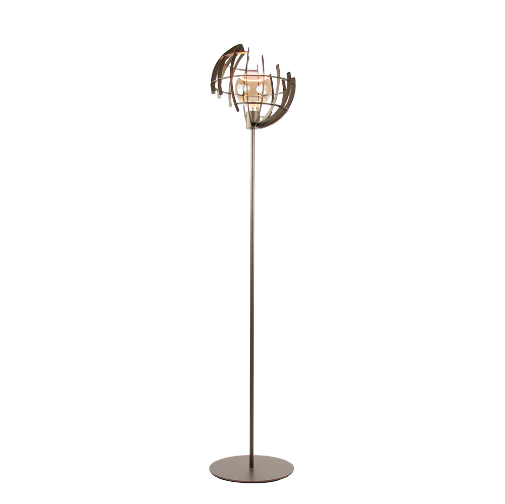 De Terra vloerlamp van Ztahl is een opvallende designstatement die perfect past in moderne én industriële interieurs. De open bolvorm is opgebouwd uit platte metalen ribben van 20 mm breed en heeft een speelse ronde uitsnede, waardoor de lamp vanuit elke hoek een ander karakter laat zien.