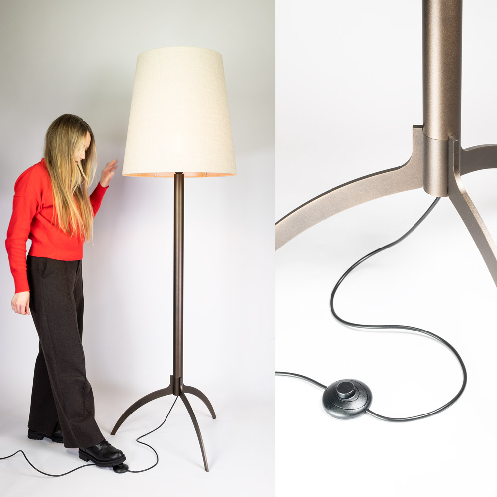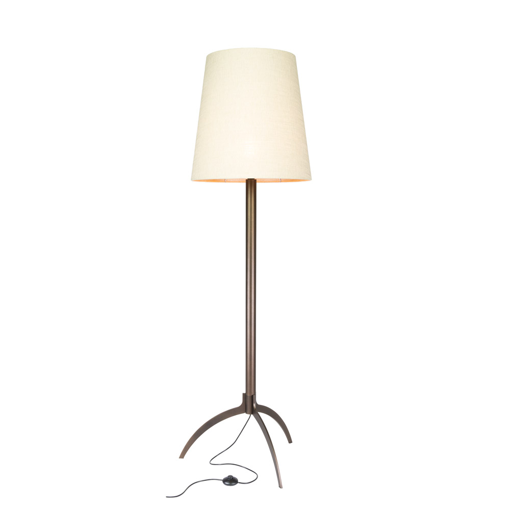 Highlights • Grote vloerlamp met krachtige, architectonische uitstraling • Royale stoffen kap voor zacht en gelijkmatig licht • Stevige metalen voet met uitgespreide poten • Perfect naast een bank, loungefauteuil of in een ruime hoek • E27 fitting – kies zelf de lichtbron en sfeer