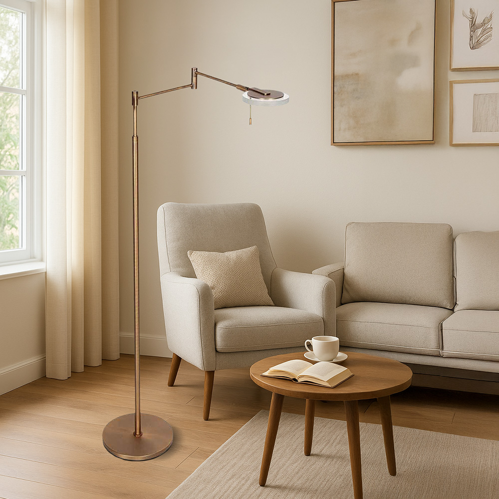 Deze elegante vloerlamp in warme bronskleur is een moderne klassieker die sfeer en functionaliteit moeiteloos combineert. De lamp is uitgerust met een verstelbare arm en een draaibare kop, waardoor je het licht eenvoudig richt voor optimaal leescomfort. De geïntegreerde LED-verlichting zorgt voor een aangenaam warm wit licht en is energiezuinig in gebruik. Het slanke, tijdloze ontwerp met zwenkarm maakt deze lamp perfect voor naast de bank of een fauteuil, zonder visueel te overheersen in je interieur.