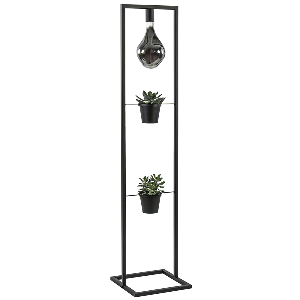 Deze leuke decoratieve vloerlamp brengt sfeer en gezelligheid met zich mee. De strak vormgegeven lamp heeft een metalen armatuur dat is uitgevoerd in het mat zwart. In het frame is bovenaan een E27 fitting geplaatst. Deze biedt ruimte voor een mooie decoratieve lichtbron. Verder is over het metalen frame op 2 plekken een plantenpot toegepast waar een leuke plant of bloemen in kan worden gezet. De decoratieve vloerlamp is voorzien van een zwart snoer met schakelaar.