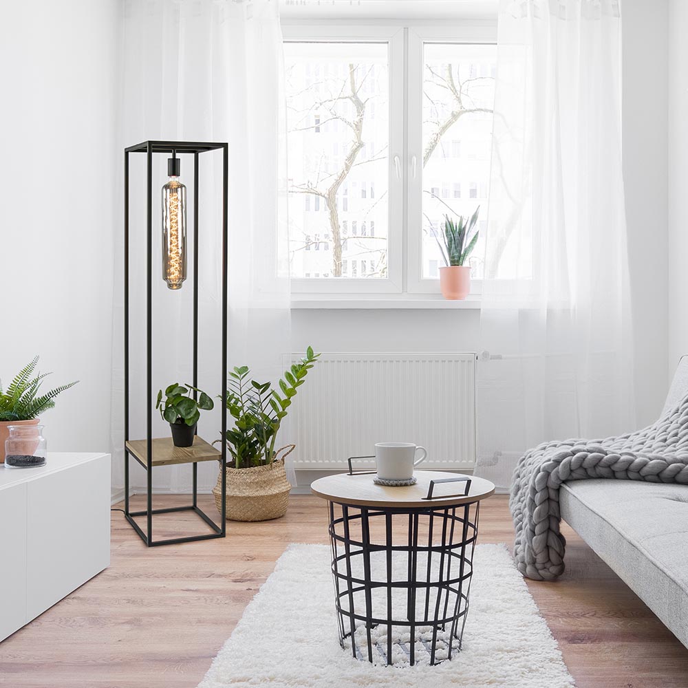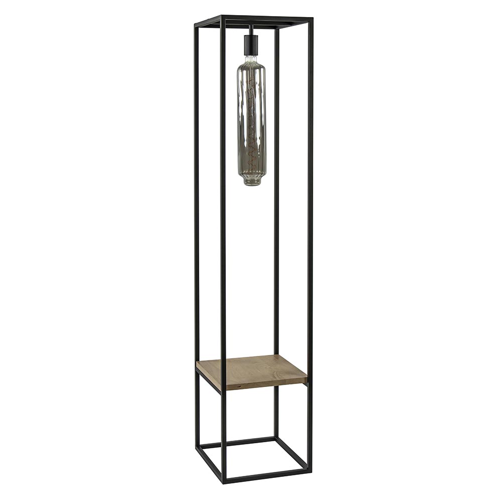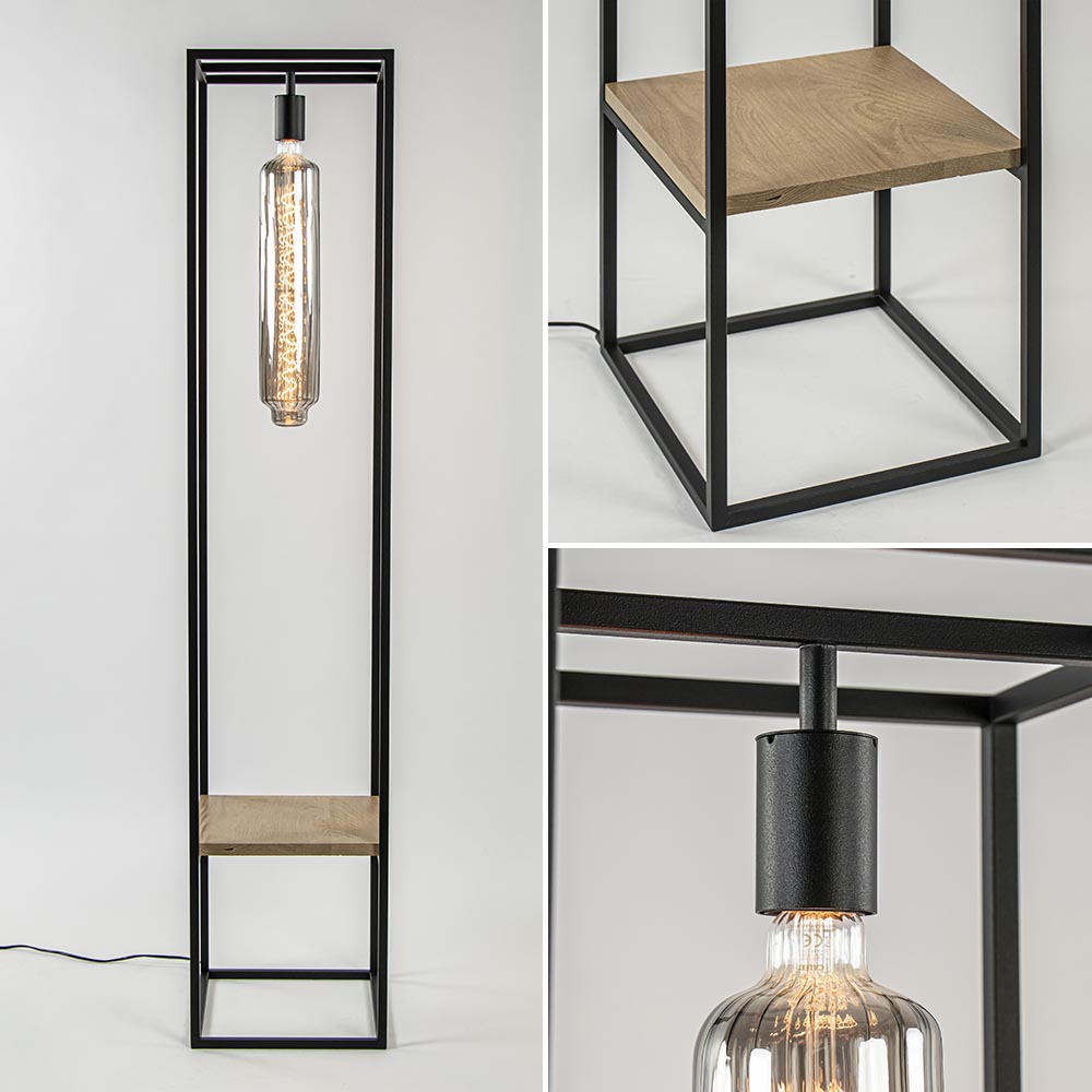 Maak het interieur helemaal af met deze stoere vloerlamp frame. De staande lamp zorgt voor sfeer en functie door de toevoeging van de houten plank. Ideaal voor een leuke plant, boeken of een leuk accessoire. De strakke vloerlamp wordt geleverd exclusief lichtbron. Kies voor een decoratieve lichtbron voor een fijne sfeer of juist een spot (05320014) die de objecten op het plankje uitlicht. Er is van alles mogelijk. De frame vloerlamp met houten plank is voorzien van een zwart snoer met een lengte van 160 cm en een schakelaar op 60 cm.