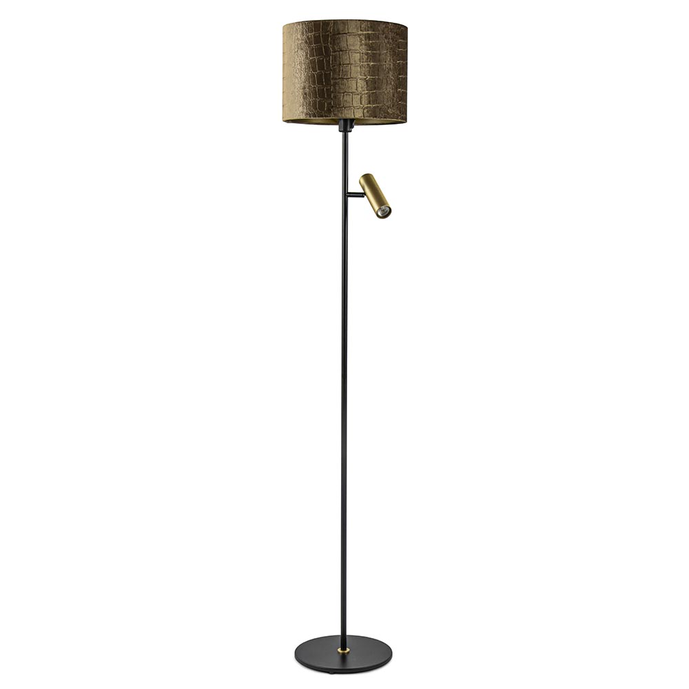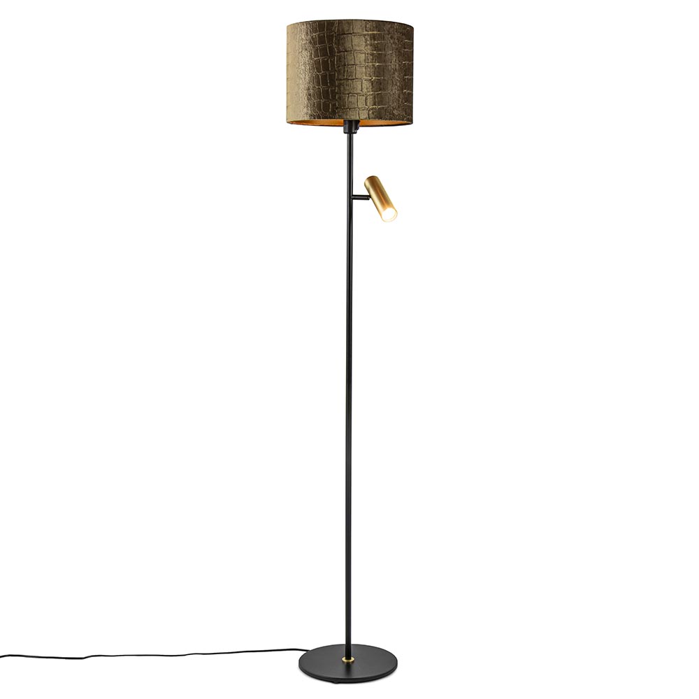 Een trendy vloerlamp met een luxe uitstraling. De staande lamp heeft een metalen armatuur dat is uitgevoerd in het mat zwart. Dit is gecombineerd met een verstelbare leeslamp in het goud. Deze heeft een GU10 mini lichtpunt zodat de spot een strak en smal design kan hebben. De trendy vloerlamp met leeslamp is compleet gemaakt met een velourse bronzen kap met gouden binnenzijde. De stoffen kap is voorzien van een print wat helemaal past binnen de huidige woontrends. De vloerlamp met kap heeft een zwart snoer met een lengte van 220 cm.