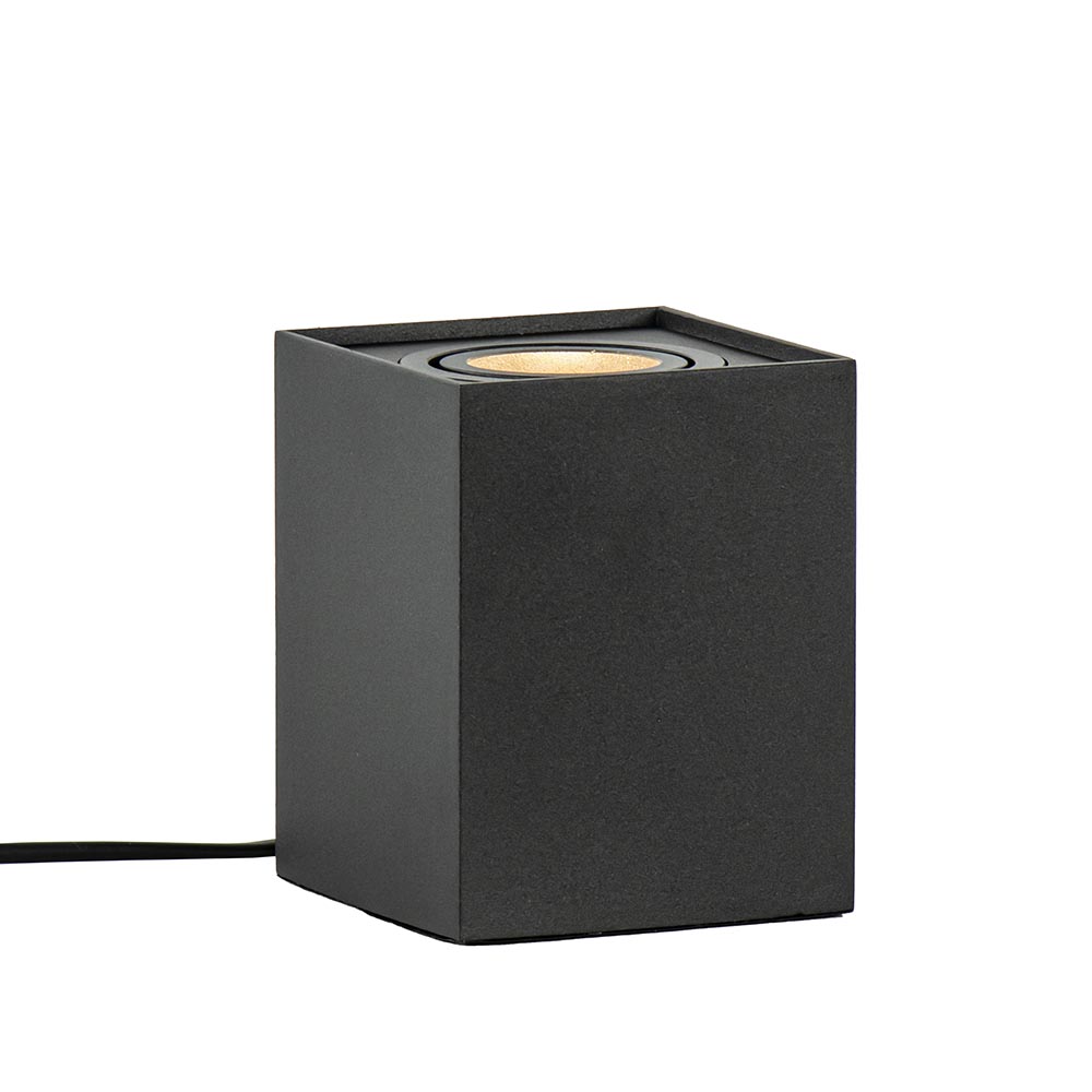 Een spot hoeft niet alleen aan het plafond handig te zijn. Ook deze kleine tafellamp is een ideale toevoeging aan het interieur. Perfect om een kast of een donkere hoek uit te lichten. Zet de tafellamp daar waar u hem nodig heeft. De GU10 spot is te draaien en te kantelen zodat u de lichtrichting ook kunt bepalen. De kleine vierkante tafellamp is gemaakt van metaal en uitgevoerd in het mat zwart. Het snoer heeft een lengte van 195 cm en is op 50 cm voorzien van een knipschakelaar. De GU10 tafellamp spot wordt geleverd zonder lichtbron.