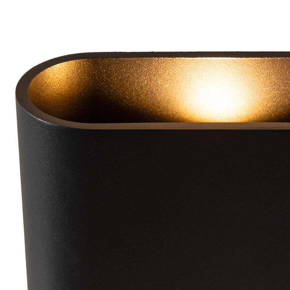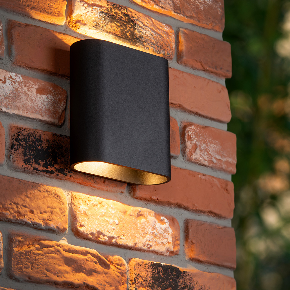 Deze moderne up & down wandlamp is een echte blikvanger voor aan de buitenmuur. Het strakke, afgeronde ontwerp in matzwart zorgt voor een eigentijdse uitstraling. De lamp schijnt zowel naar boven als naar beneden en creëert zo een sfeervol lichteffect op de muur. Gemaakt van hoogwaardig aluminium en geschikt voor buitengebruik dankzij de waterdichte afwerking (IP54). Perfect voor het verlichten van je gevel, tuinpad, terras of entree.