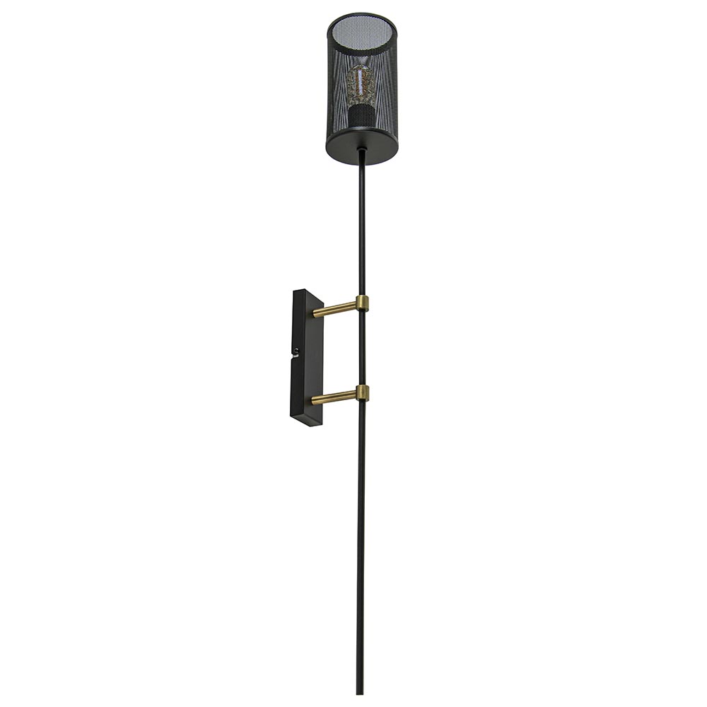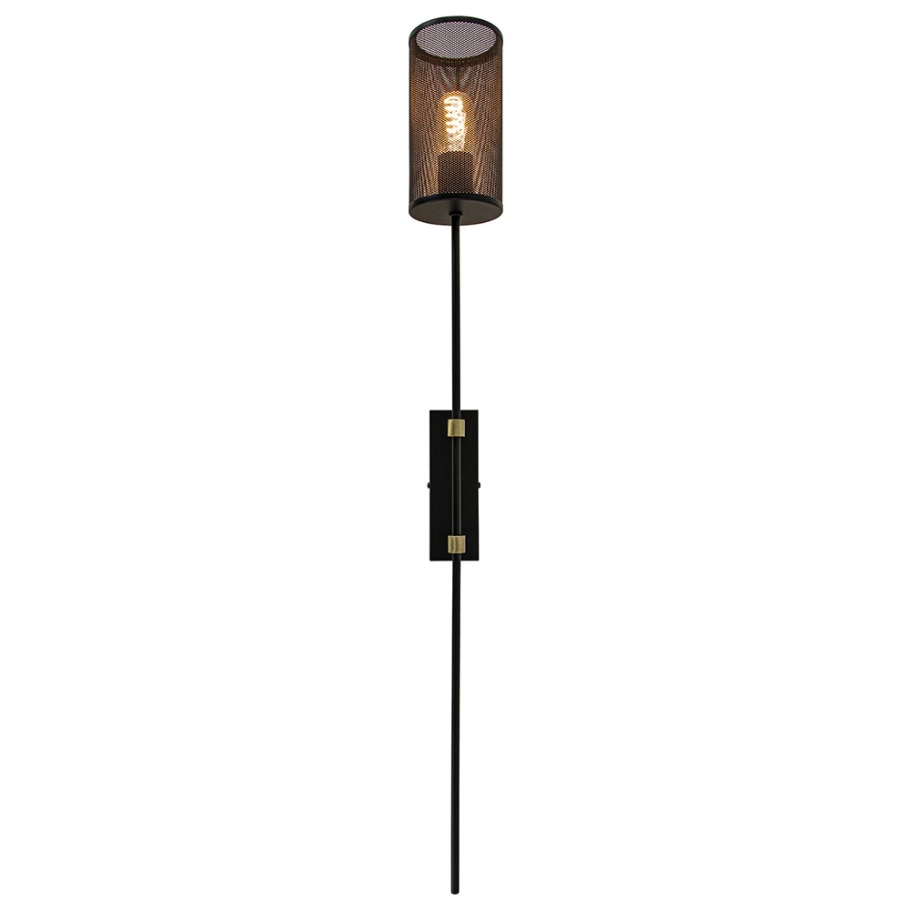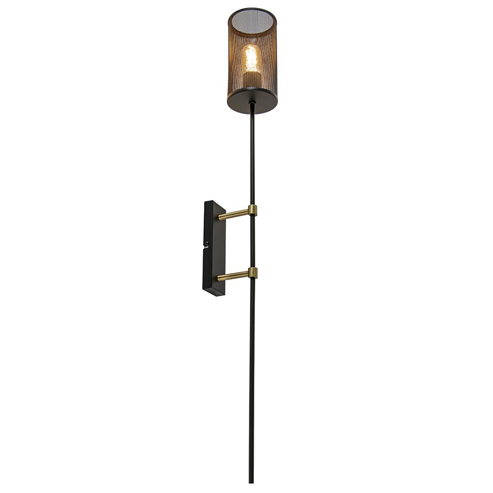 Deze stoere wandlamp is een verrijking voor het interieur. De wandlamp is gemaakt van metaal en uitgevoerd in het mat zwart. Het armatuur is gecombineerd met een cilinder vormige kap met metaalgaas. Dit geeft de lamp een industriële look. De gouden armen zorgen daarentegen voor een chique touch aan de lamp. De wandlamp heeft een hoogte van 100 cm en is niet voorzien van een snoer. De mat zwarte wandlamp wordt geleverd exclusief lichtbron.