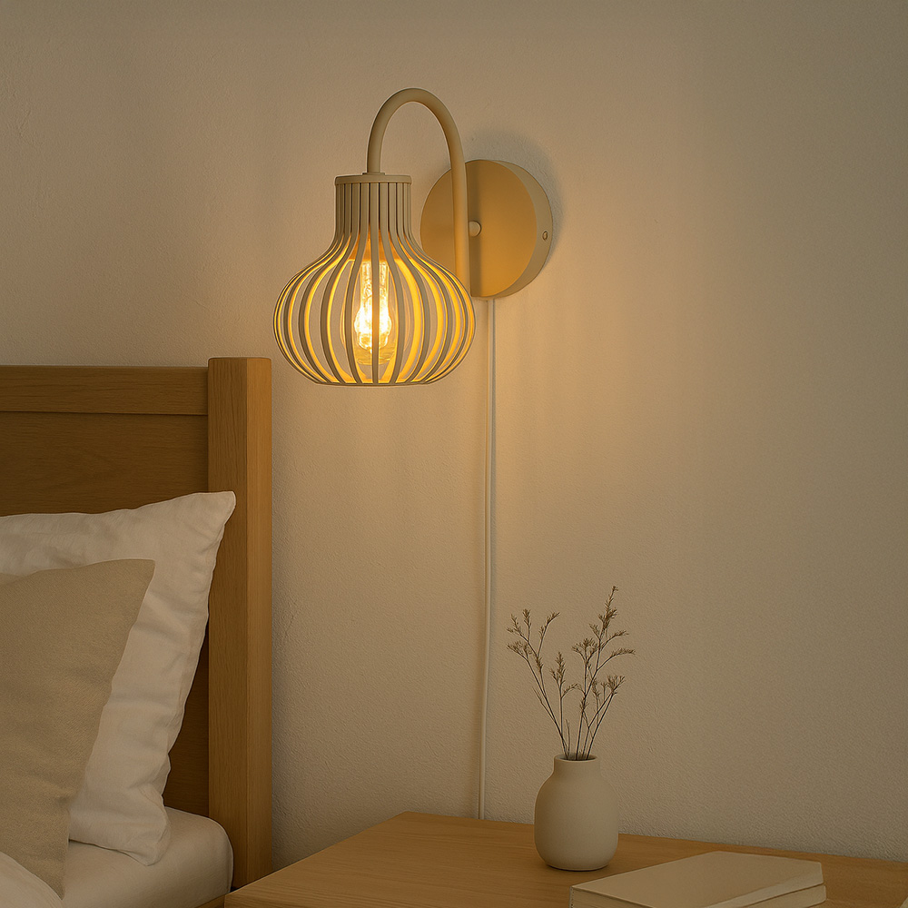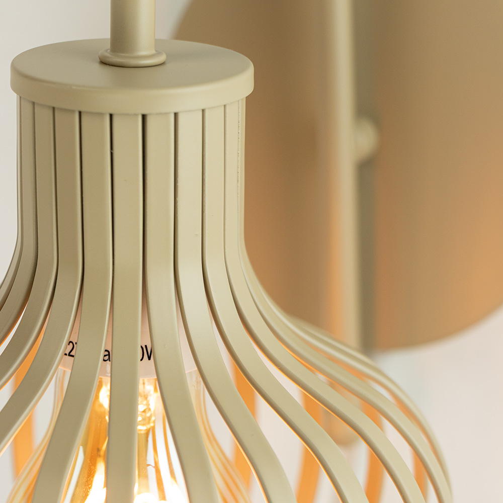Een elegante en moderne toevoeging aan je interieur! Deze stijlvolle wandlamp is perfect voor het creëren van sfeer in je woonkamer, hal of slaapkamer. Het open design met speelse metalen spijlen zorgt voor een prachtige lichtval en geeft de lamp een luchtige en moderne uitstraling. Dankzij de neutrale beige kleur past deze wandlamp moeiteloos bij verschillende woonstijlen zoals Scandinavisch, Japandi of modern minimalistisch.