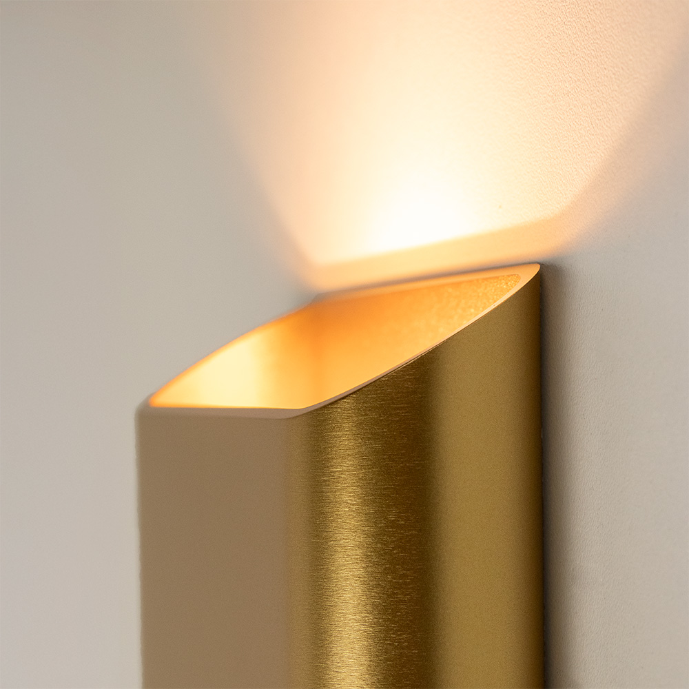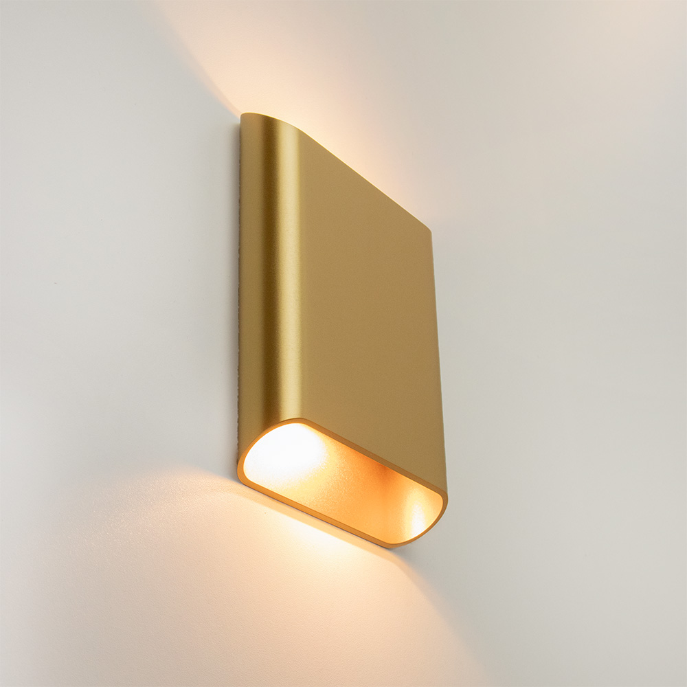 Mooi strak design wandlamp uitgevoerd in de kleur matgoud. Een mooie sfeermaker voor in de hal, woonkamer of slaapkamer. De wandlamp is klein van stuk maar zorgt voor een groot effect in de ruimte. Deze bronze wandlamp werkt als een up- & downlighter, hij geeft zowel licht naar boven als naar beneden langs de muur doormiddel van geïntergreerd LED. De wandlamp is dimbaar middels een externe dimmer.