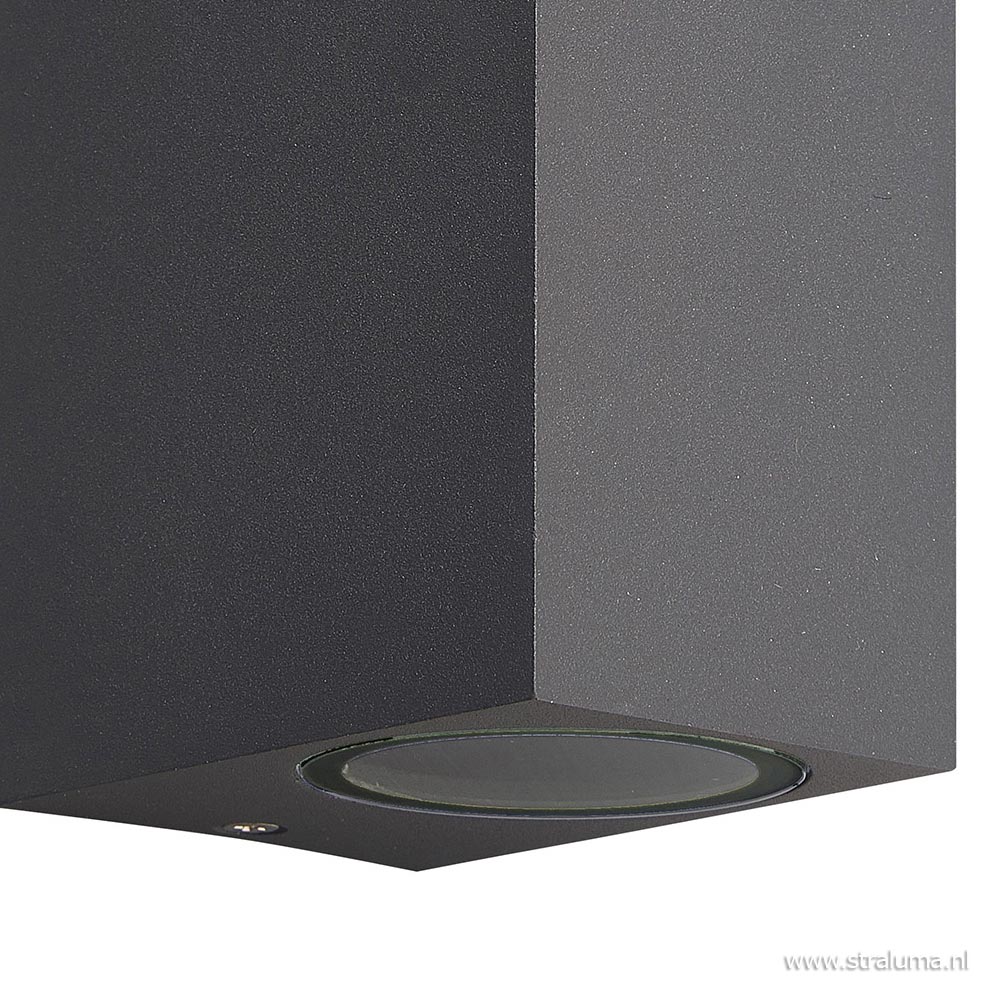 – lamp heeft een totale afmeting van 9,5x7x15 cm – aluminium, antraciet – exclusief lichtbron (2x GU10) – IP54 goedgekeurd – weerbestendig van -10° tot +45°C – gewicht: 0,52 kg