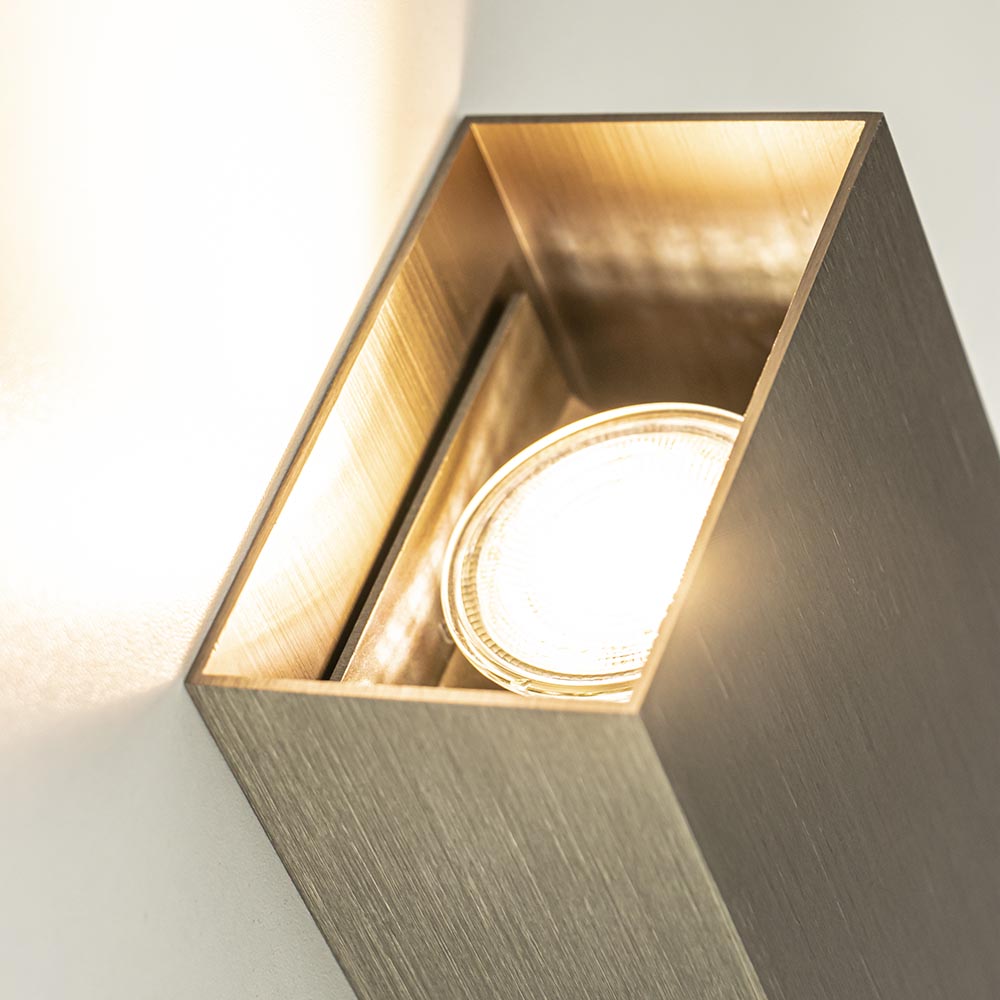 Een mooie sfeermaker voor in de hal, woonkamer of slaapkamer. De wandlamp is klein van stuk maar zorgt voor een groot effect in de ruimte. De rechthoekige wandlamp werkt namelijk als een up en downlighter. De wandlamp is van binnen voorzien van 2 GU10 fittingen. Dit zorgt voor een sfeervol zandloper effect op de wand. De wandlamp is niet voorzien van een snoer en wordt geleverd exclusief lichtbron. De wandplaat kan eenvoudig los worden gemonteerd op de muur waarna de rechthoekige kap eroverheen kan worden geschoven.