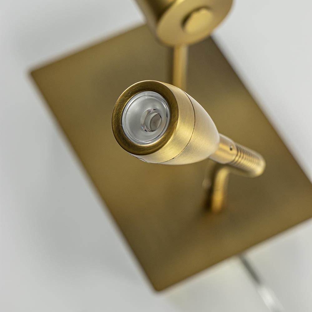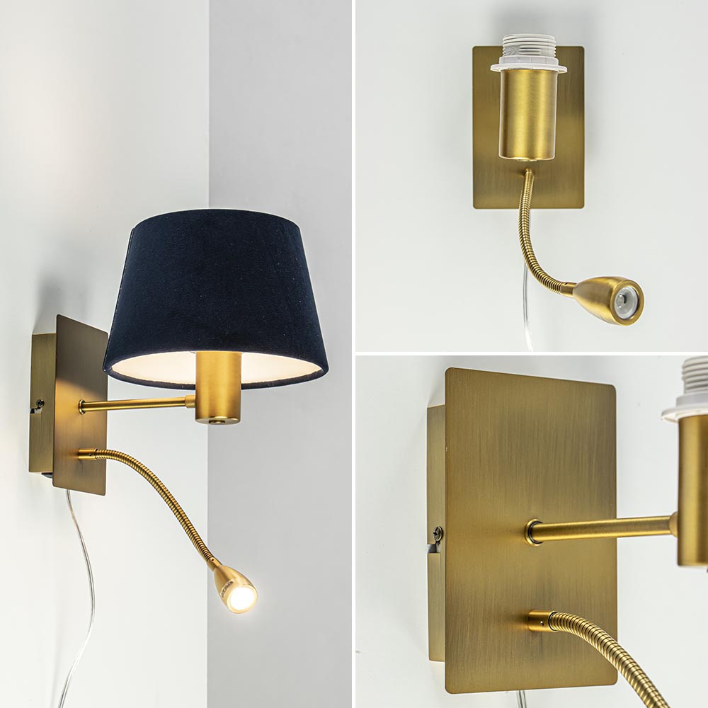 Deze klassieke wandlamp is de perfecte lamp voor naast het bed. De leesarm zorgt dat je nog even een boek kan lezen in bed, met de lichtbron in de kap (exclusief) krijgt u sfeer in de slaapkamer. Het flexiblele deel van de leesarm is 18 cm. Het lampje is een 3 watt geïntegreerde lichtbron. Het lampje is voorzien van een transparant snoer. Beide lampen zijn apart van elkaar te bedienen met de knopjes aan de onderzijde van de wandbevestiging van de lamp! Maak de lamp compleet met een kapje dat past bij uw interieur. De kap op de foto heeft een doorsnede van 20 cm en is 14 cm hoog. Kom langs bij onze kappenbalie in de showroom , daar heeft u een grote hoeveelheid keuze voor het perfecte kapje voor uw wandlamp!
