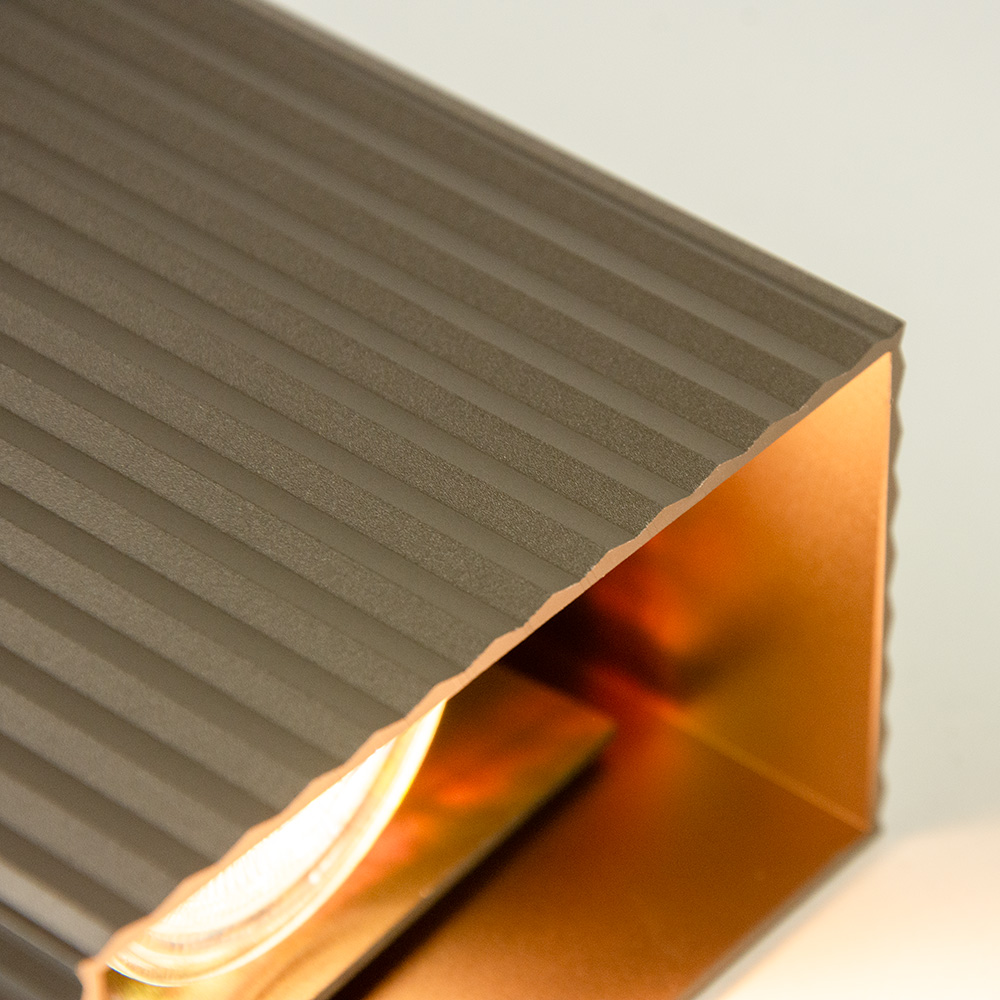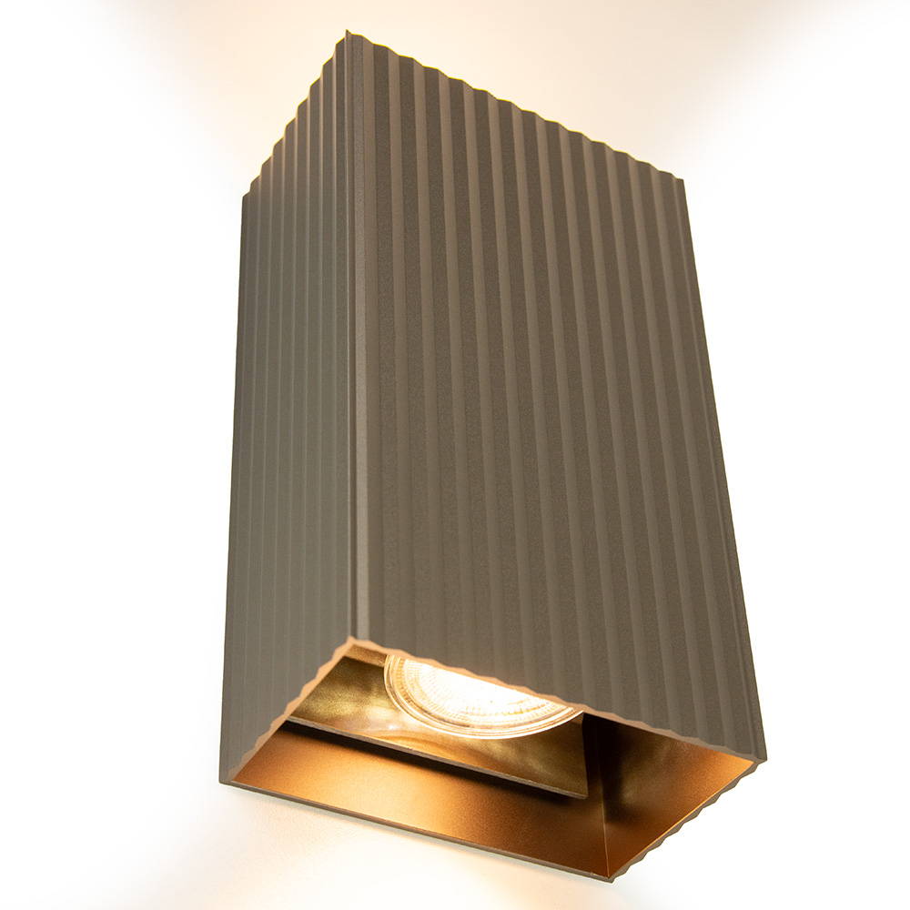 De nieuwste aanwinst onder onze wandlampen. Deze mooie sfeermaker is uitgevoerd in aluminium en voorzien van een ribbel in een warme bronzen kleur. Dit geeft een heel mooi chique effect. Geschikt voor in de hal, woonkamer of slaapkamer. De wandlamp is klein van stuk maar zorgt voor een groot effect in de ruimte. De rechthoekige wandlamp werkt namelijk als een up en downlighter. De wandlamp is van binnen voorzien van 2 GU10 fittingen. Dit zorgt voor een sfeervol zandloper effect op de wand. De wandlamp is niet voorzien van een snoer en wordt geleverd exclusief lichtbron. De wandplaat kan eenvoudig los worden gemonteerd op de muur waarna de rechthoekige kap eroverheen kan worden geschoven.