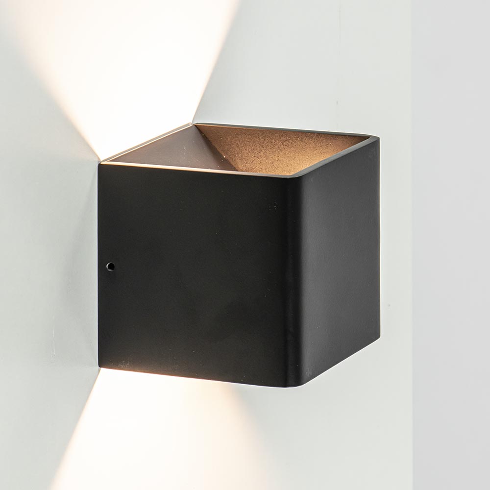 Een minimalitisch design met een sfeervol effect. Deze kleine wandlamp zorgt door het zandloper effect op de muur voor een fijne sfeerverlichting. De mat zwarte wandlamp is vierkant en van binnen voorzien van LED verlichting. Het LED geeft met 2700 Kelvin warm witte verlichting en zorgt met 600 lumen voor een prima lichtopbrengst. Het matte zwart zorgt dat de vierkante LED wandlamp mooi overloopt op een donkere wand, of juist meer opvalt op een contrasterende kleur. De zwarte kubus heeft geen snoer en dient direct op een stroompunt te worden aangesloten. Ideaal voor extra sfeer in de woonkamer, hal of slaapkamer.
