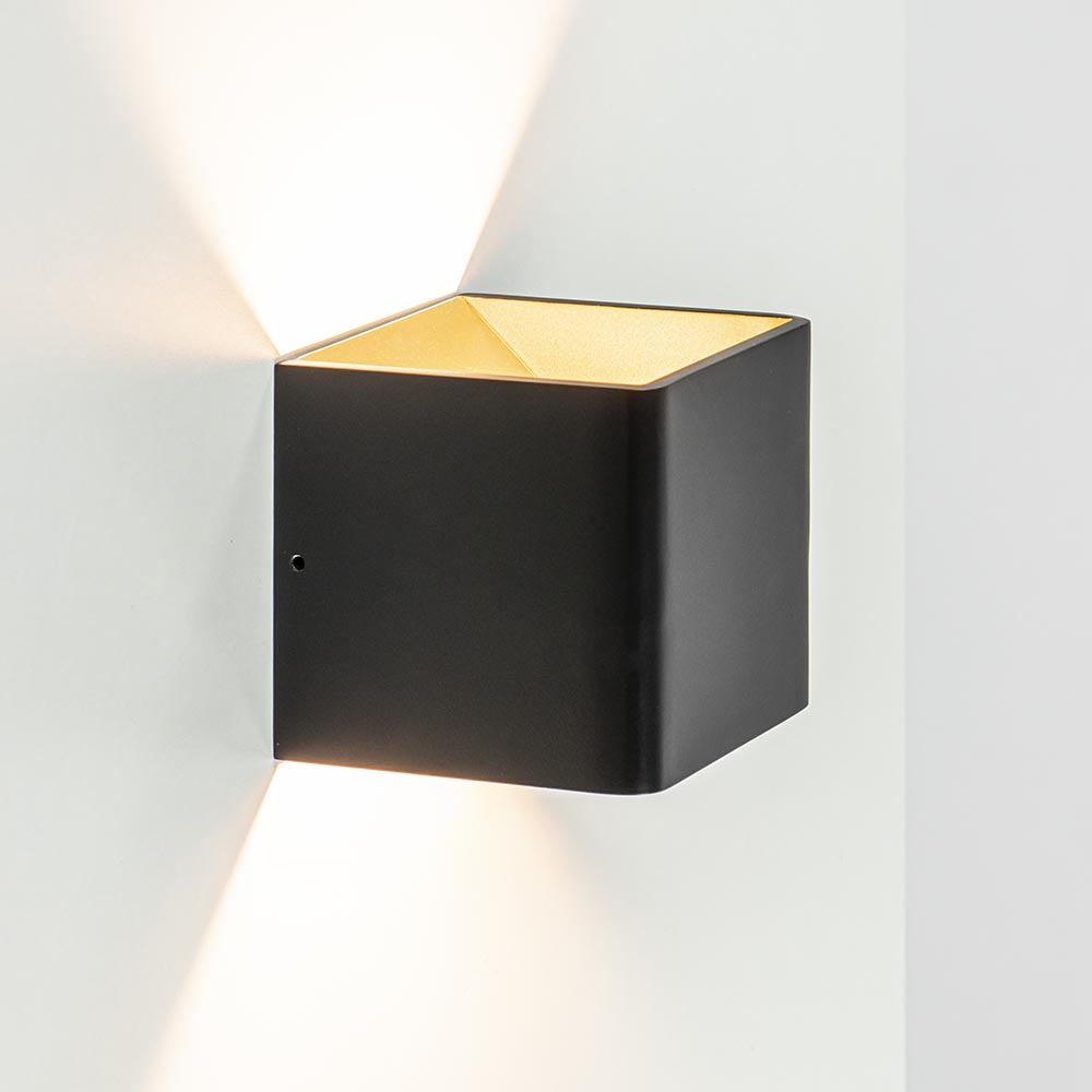 Een minimalitisch design met een sfeervol effect. Deze kleine wandlamp zorgt door het zandloper effect op de muur voor een fijne sfeerverlichting. De zwart met gouden wandlamp is vierkant en van binnen voorzien van LED verlichting. Het LED geeft met 2700 Kelvin warm witte verlichting en zorgt met 600 lumen voor een prima lichtopbrengst. Het matte zwart zorgt dat de vierkante LED wandlamp mooi overloopt op een donkere wand, of juist meer opvalt op een contrasterende kleur. De mat zwart met gouden kubus heeft geen snoer en dient direct op een stroompunt te worden aangesloten. Ideaal voor extra sfeer in de woonkamer, hal of slaapkamer.