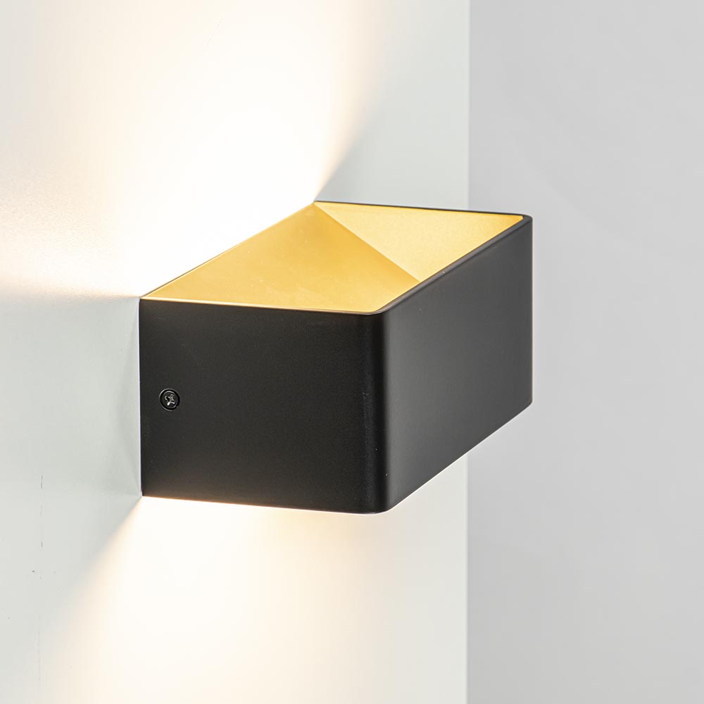 Een minimalitisch design met een sfeervol effect. Deze moderne wandlamp zorgt door het zandloper effect op de muur voor een fijne sfeerverlichting. De zwart met gouden wandlamp is rechthoekig en van binnen voorzien van LED verlichting. Het LED geeft met 2700 Kelvin warm witte verlichting en zorgt met 600 lumen voor een prima lichtopbrengst. Het matte zwart zorgt dat de rechthoekige LED wandlamp mooi overloopt op een donkere wand, of juist meer opvalt op een contrasterende kleur. De mat zwart met gouden wandlamp heeft geen snoer en dient direct op een stroompunt te worden aangesloten. Ideaal voor extra sfeer in de woonkamer, hal of slaapkamer.