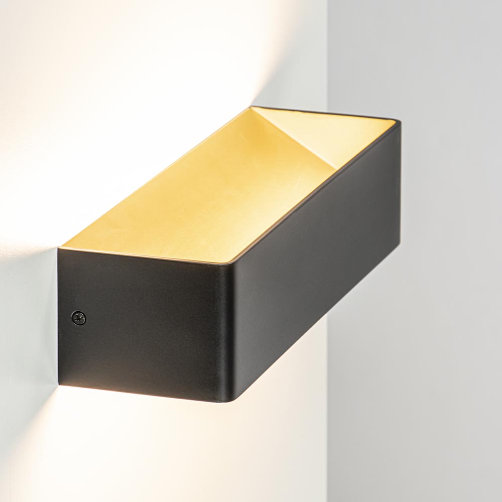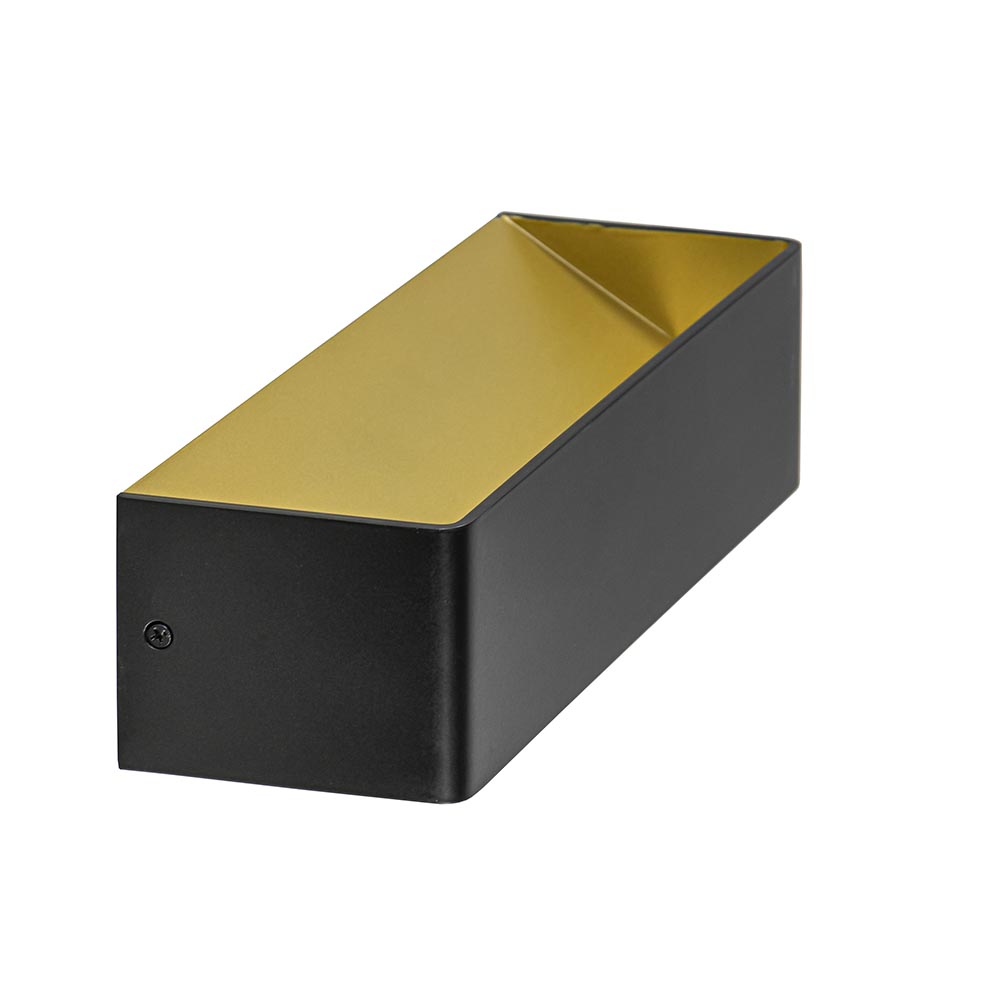 Een minimalitisch design met een sfeervol effect. Deze moderne wandlamp zorgt door het zandloper effect op de muur voor een fijne sfeerverlichting. De zwart met gouden wandlamp is rechthoekig en van binnen voorzien van LED verlichting. Het LED geeft met 2700 Kelvin warm witte verlichting en zorgt met 600 lumen voor een prima lichtopbrengst. Het matte zwart zorgt dat de rechthoekige LED wandlamp mooi overloopt op een donkere wand, of juist meer opvalt op een contrasterende kleur. De mat zwart met gouden wandlamp heeft geen snoer en dient direct op een stroompunt te worden aangesloten. Ideaal voor extra sfeer in de woonkamer, hal of slaapkamer.