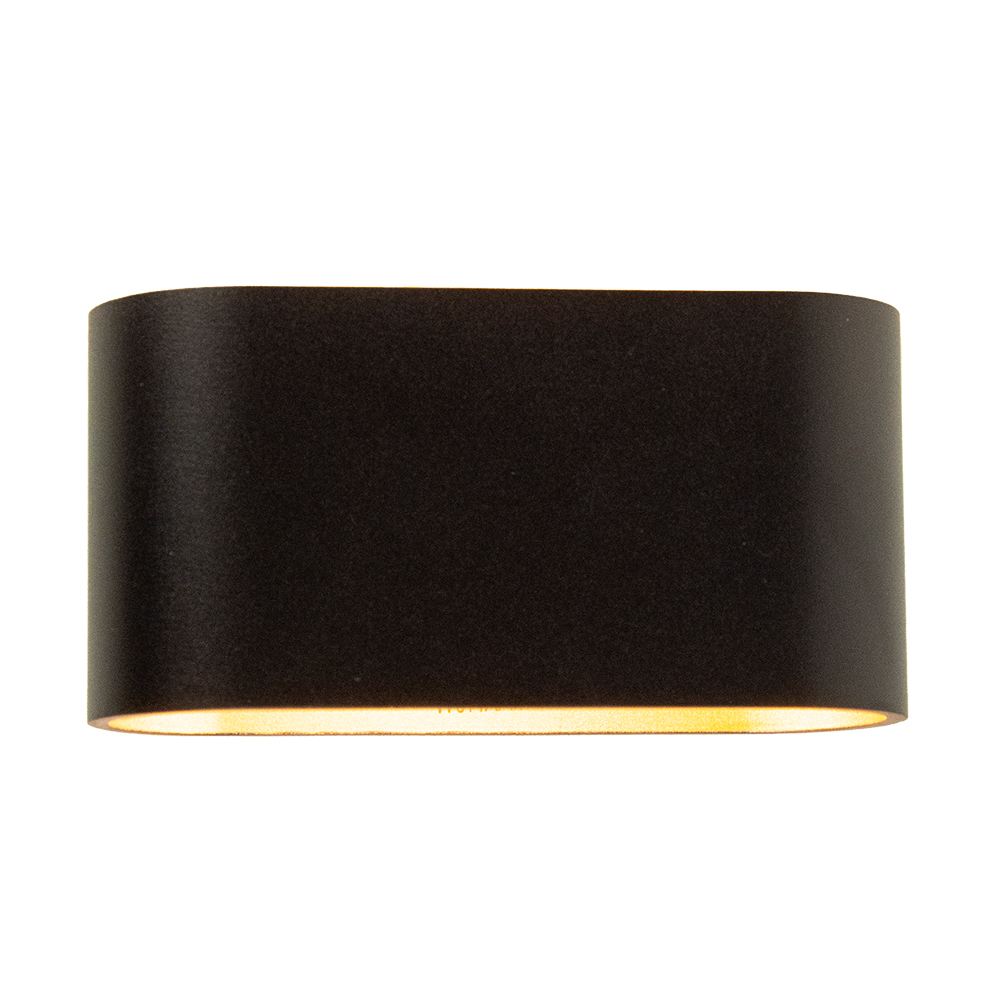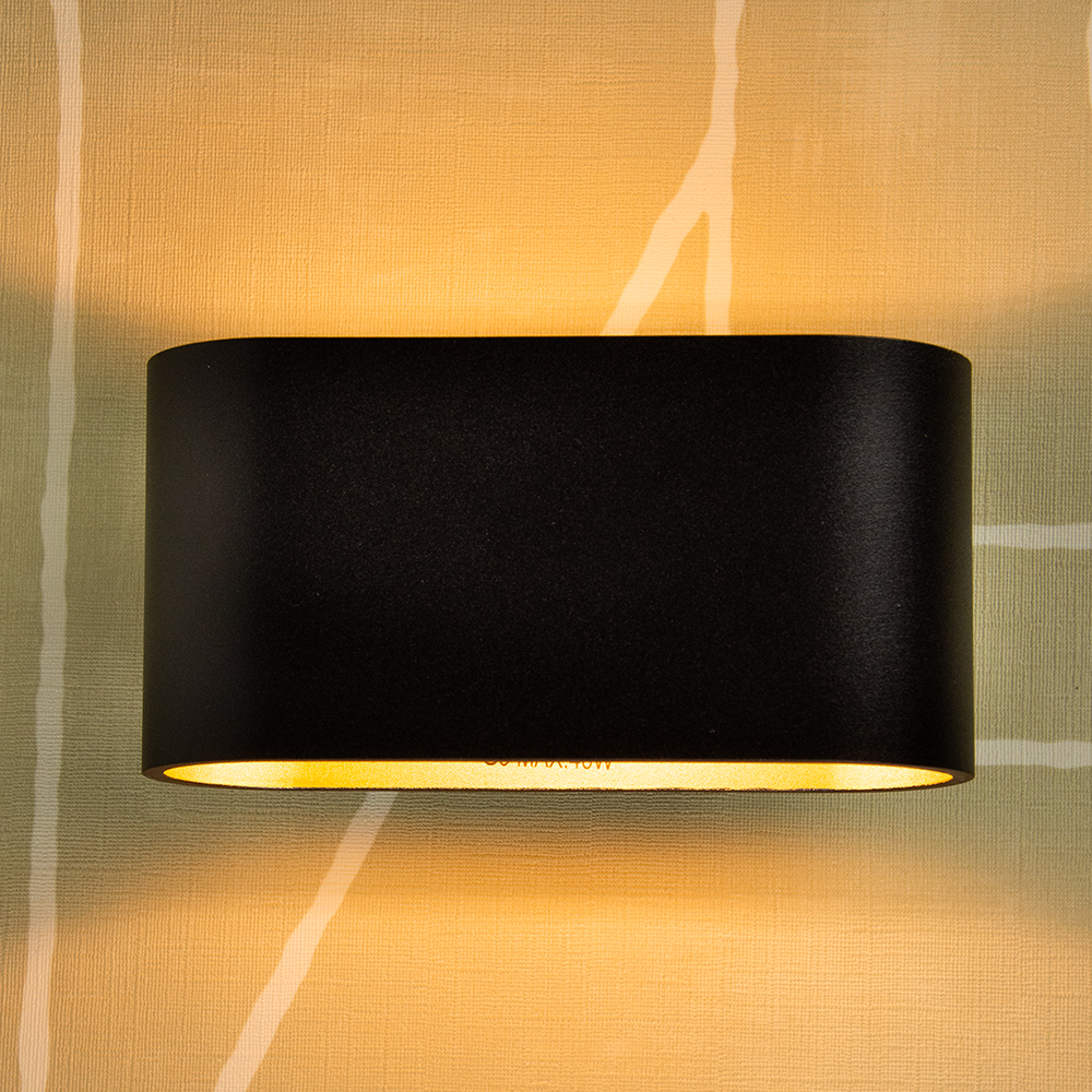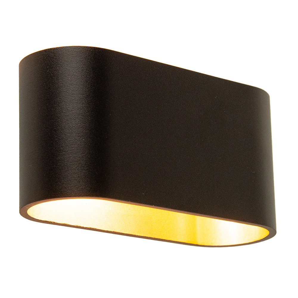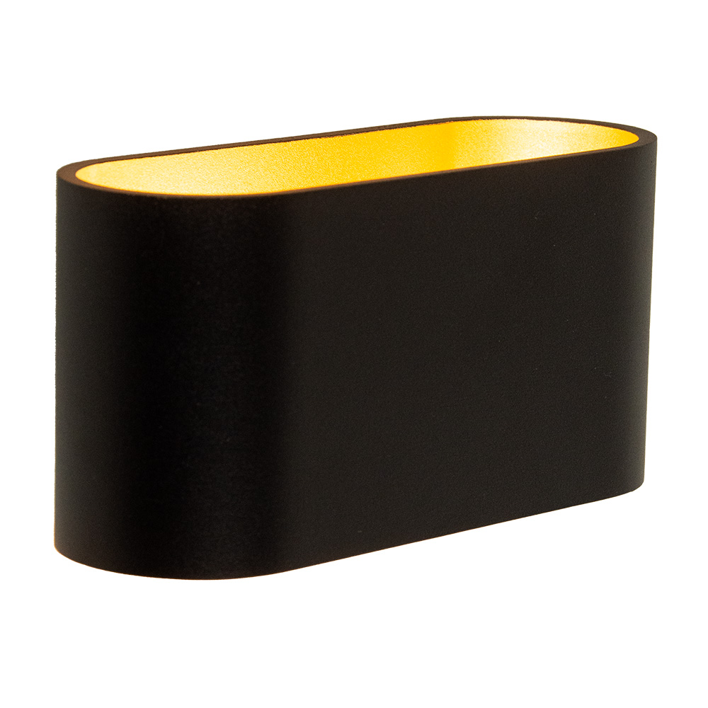 Deze stijlvolle wandlamp in zwart met goudkleurige binnenzijde is een perfecte toevoeging aan elk modern interieur. Het strakke, afgeronde ontwerp geeft een elegante en minimalistische uitstraling, terwijl de goudkleurige afwerking aan de binnenkant voor een warme gloed zorgt. De lamp verspreidt het licht zowel naar boven als naar beneden, wat zorgt voor een sfeervolle verlichting op de muur.