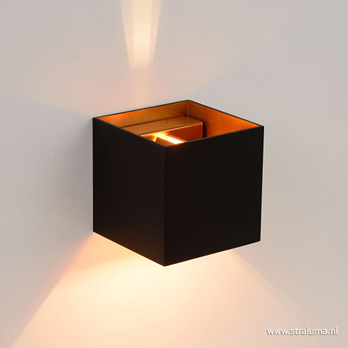 Een klein maar krachtig lampje, deze vierkante wandlamp. De zwarte kubus lamp met goudkleurige binnenkant is gemaakt van aluminium en is daardoor lekker licht, ideaal voor op een dunne wand. De lamp is voorzien van een LED lichtbron waardoor de lamp niet warm wordt en ook nog eens energiezuinig is. De lichtverspreiding is van binnenin de lamp te regelen zodat er boven, onder of aan beide richtingen verlicht wordt. Ideaal in de hal of naast het bed. Deze wandlamp is een kleine maar sterke en sfeervolle toevoeging aan uw verlichting.