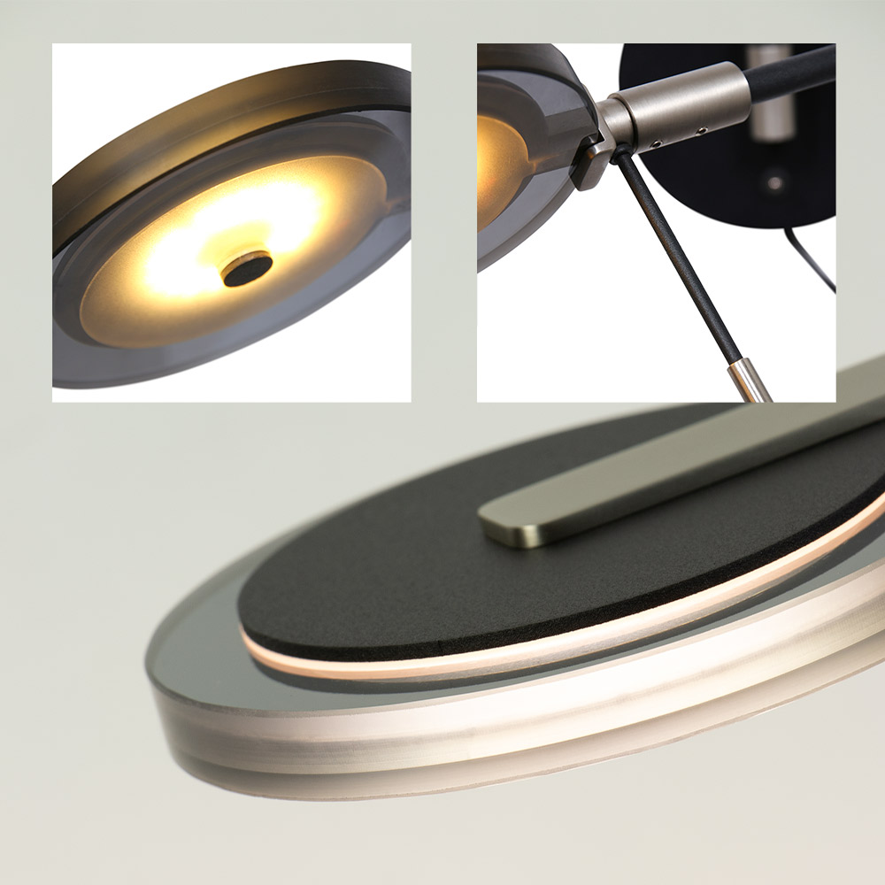 Deze eigentijdse wandlamp combineert strak design met praktische flexibiliteit. De slanke dubbele arm en ronde wandplaat in matzwart metaal geven de lamp een industriële en minimalistische uitstraling. De platte, ronde kap is voorzien van stijlvol smoked glass, wat zorgt voor een subtiel gefilterd licht met een warme, moderne gloed – perfect als leeslamp of sfeerverlichting naast het bed of in je zithoek.