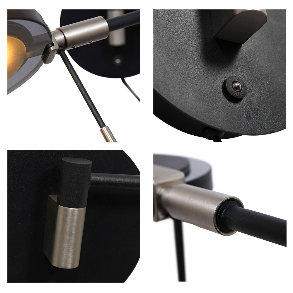 Specificaties: • Wandbevestiging: Ø 14 cm x H 3.5 cm • Kap: Ø 11 cm • Totale armlengte: 44 cm (tweedelig 20 en 24 cm) • Kleur: Mat Zwart • Materiaal: Metaal en smoked glass • Lichtbron: Geïntegreerde LED (inclusief) • Dimbaar: Nee • Schakelaar: Aan-/uitschakelaar op de wandplaat