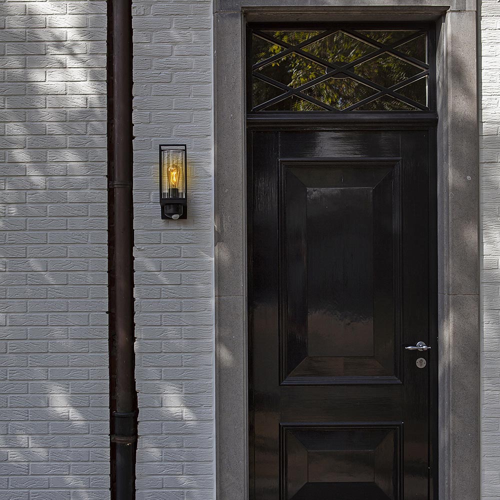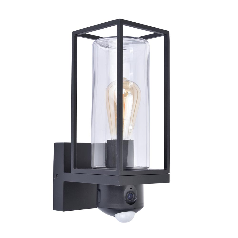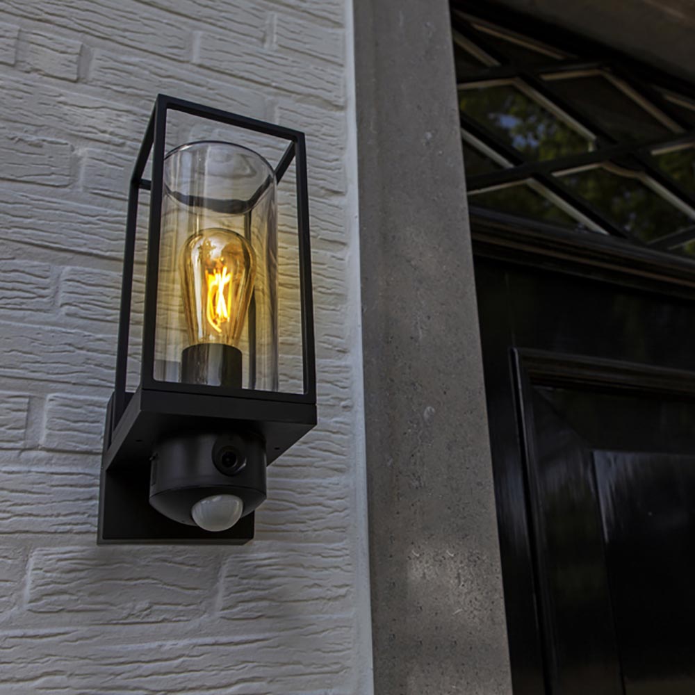 Homepagina / Lampen / Buitenlampen / Zwarte buitenlamp rechthoek met glas en camera